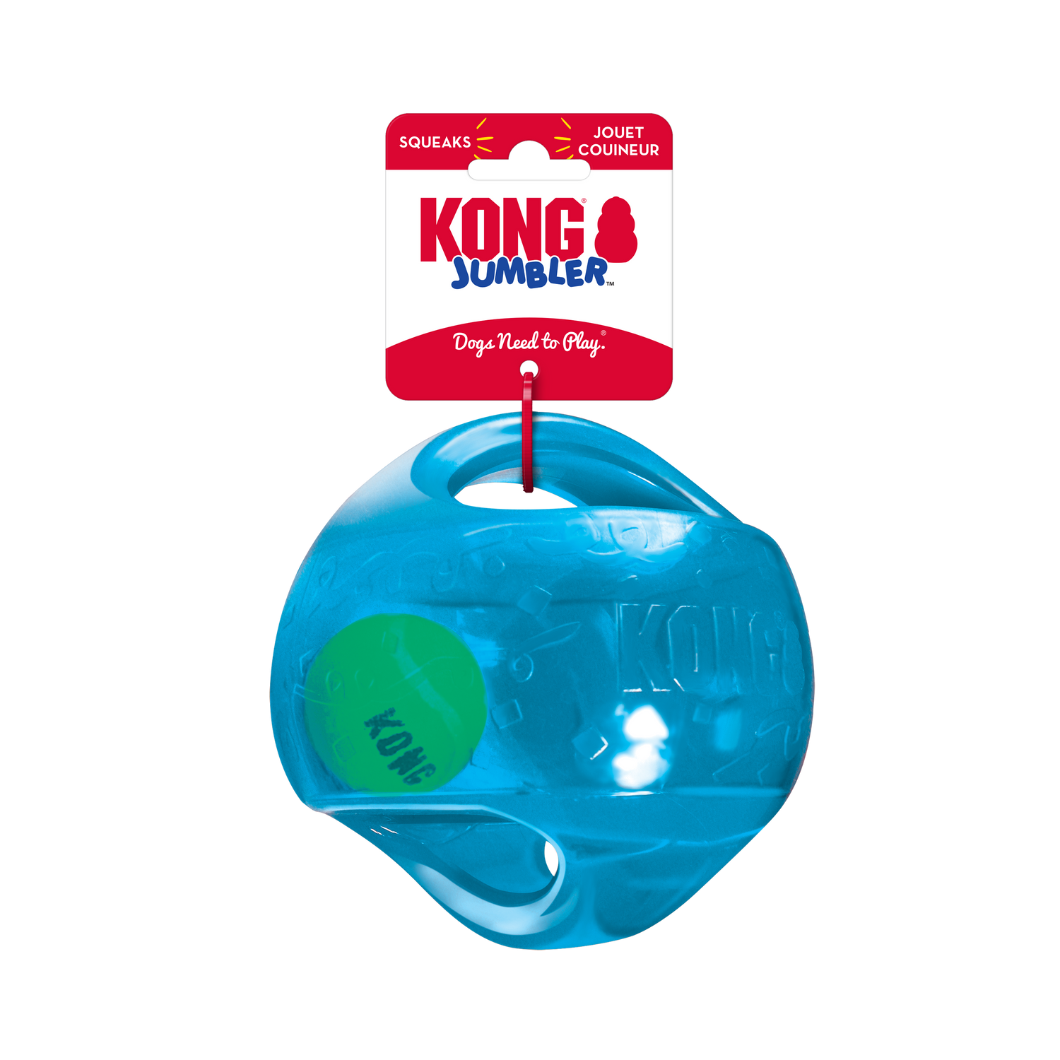 The KONG Jumbler is a two-in-one ball toy for twice the interactive fun. The interior tennis ball and loud squeak entice play, while the handles make pickup and shaking easy. The Jumbler stands up to tough play, making it ideal for games of fetch. Available in two shapes and sizes, the KONG Jumbler will ensure an exciting, active play session for you and your dog.
