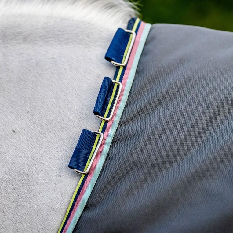 Surefit neck design, sitting further in front of the wither with a smoother slope to cup the front line of the shoulder and finish deeper in the front of the neck, Sure-fit by name and nature, this design gives a snugger fit yet the deeper neck allows more freedom to graze. Always used in conjunction with our V-Front closure, which provides freedom of shoulder movement to prevent rubbing and aids in reducing wither pressure.