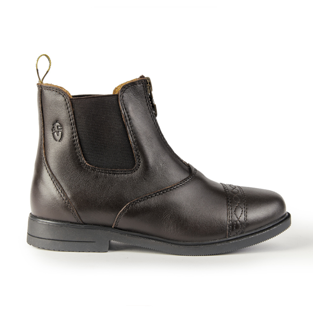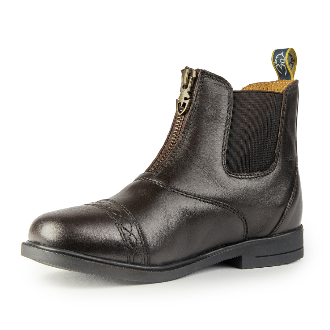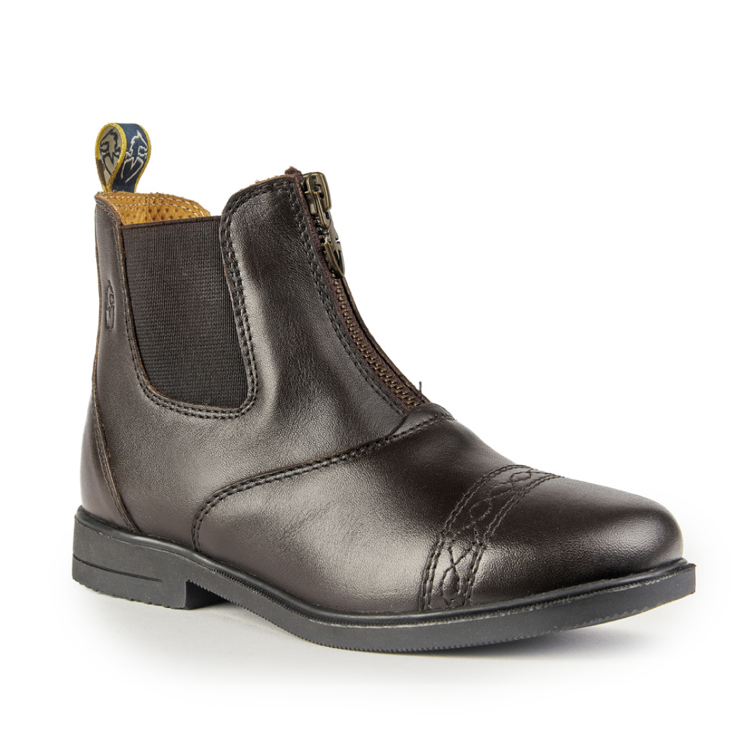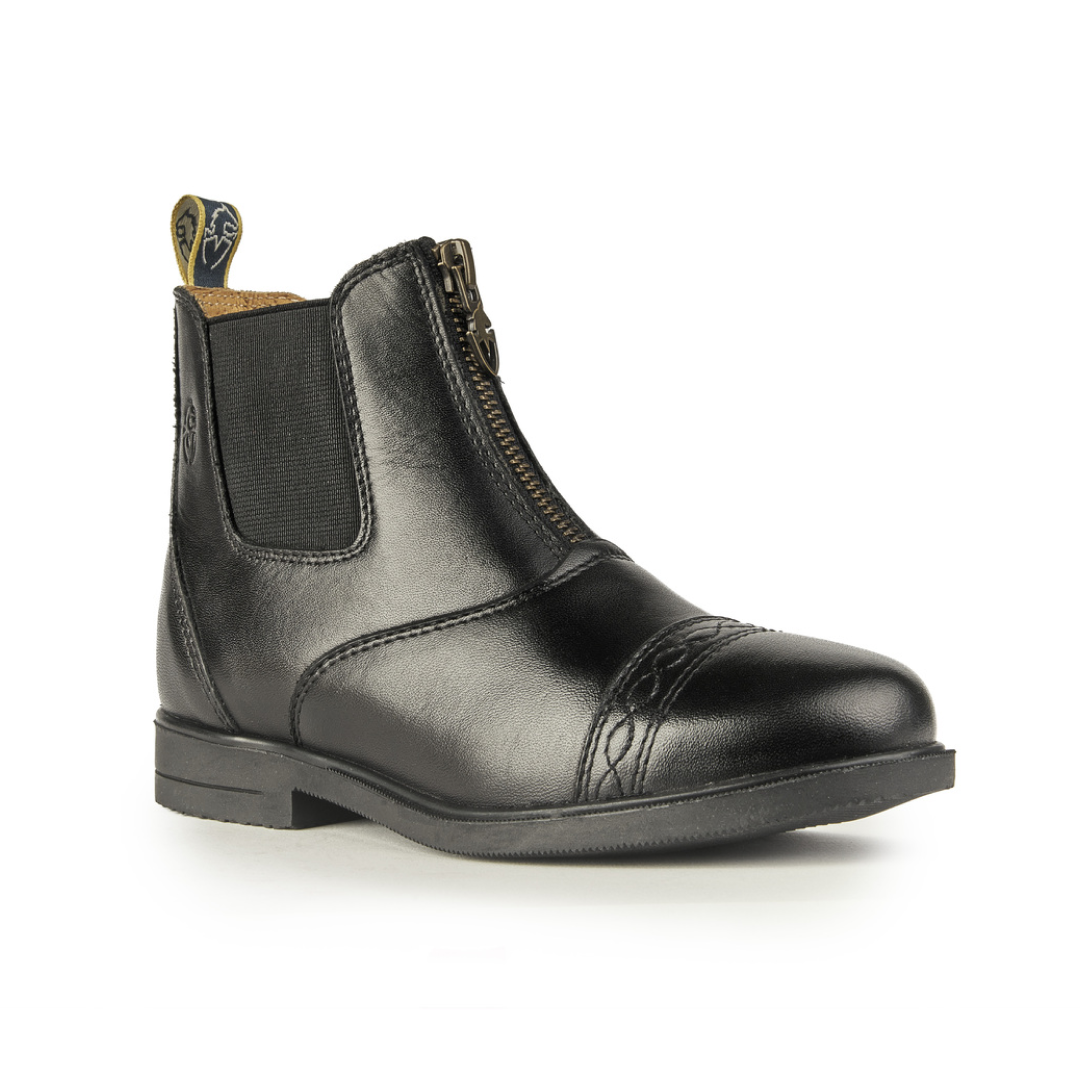 The Shires Moretta Children's Materia Boots will smarten up pony riding, these leather paddock boots are suitable for all riders, and offer a great balance between comfort and stability. The Materia zip front boots are easy to fit and have a rounded toe for plenty of space. Brogue stitching detail looks smart and the high shine polished finish resists water stains and a quick polish will restore any wear and tear.