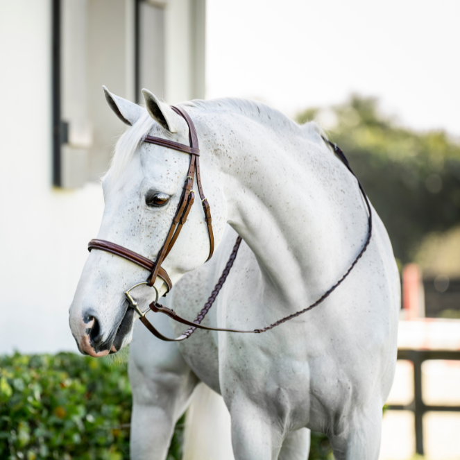 • Hunter-style browband and noseband with contrast detail.