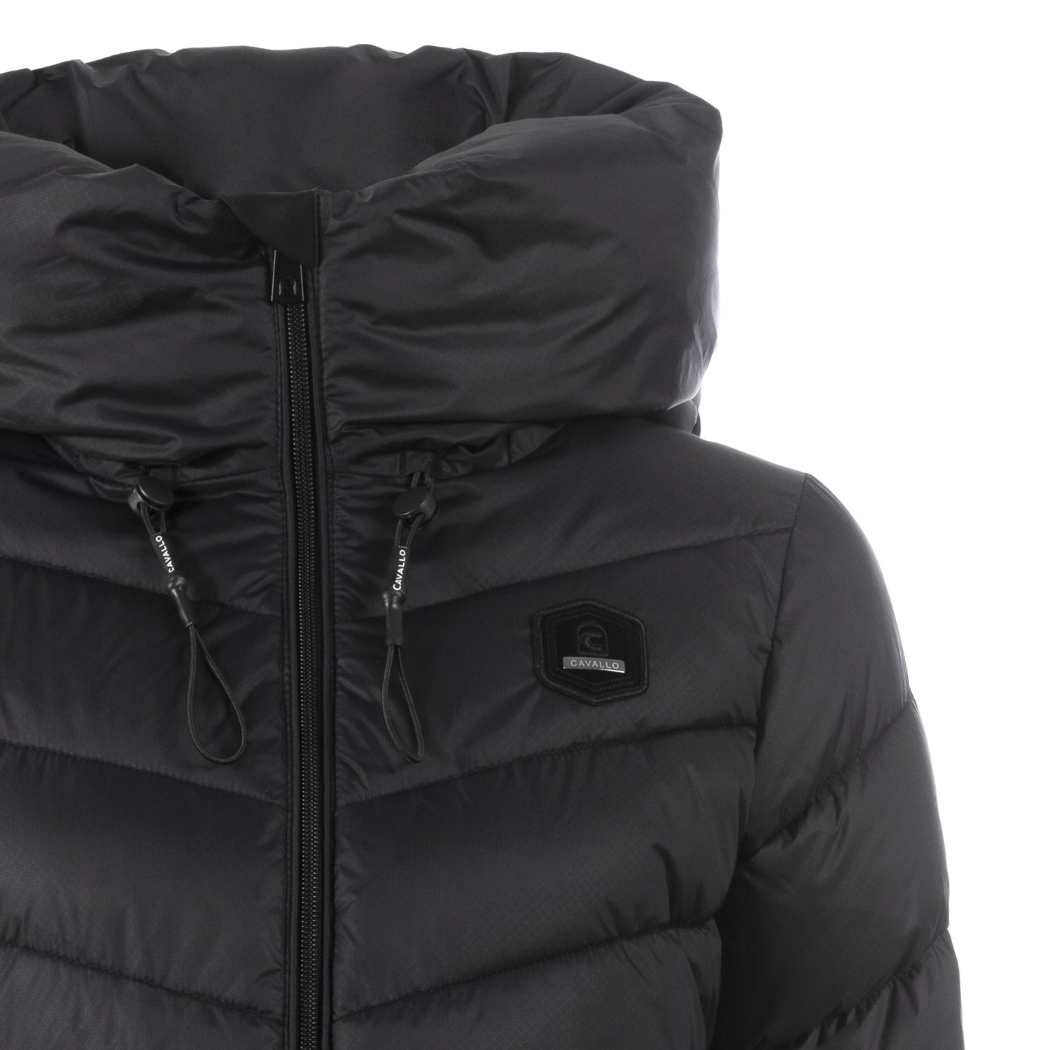 The Cavallo Maya Functional Parka features a sleek, fitted design with a large hood and high-quality label. The hood is adorned with a black drawstring and delicate white print, fastened at the back with a snap. The jacket has diagonal quilting on the upper body and horizontal quilting on the lower body, giving it a unique look.
