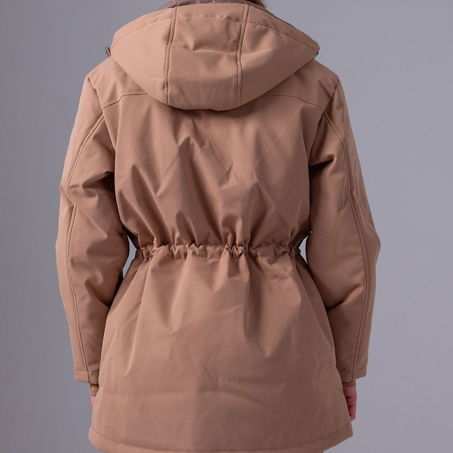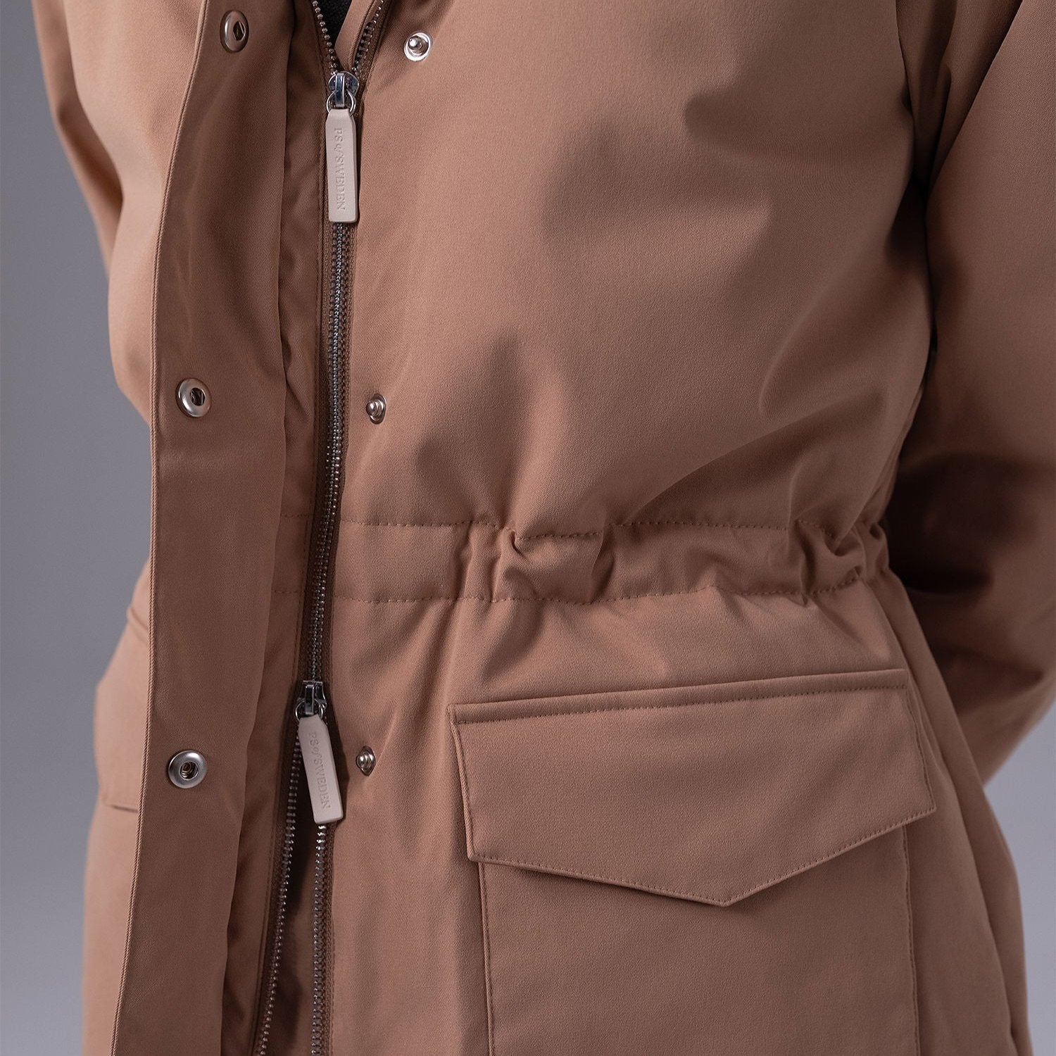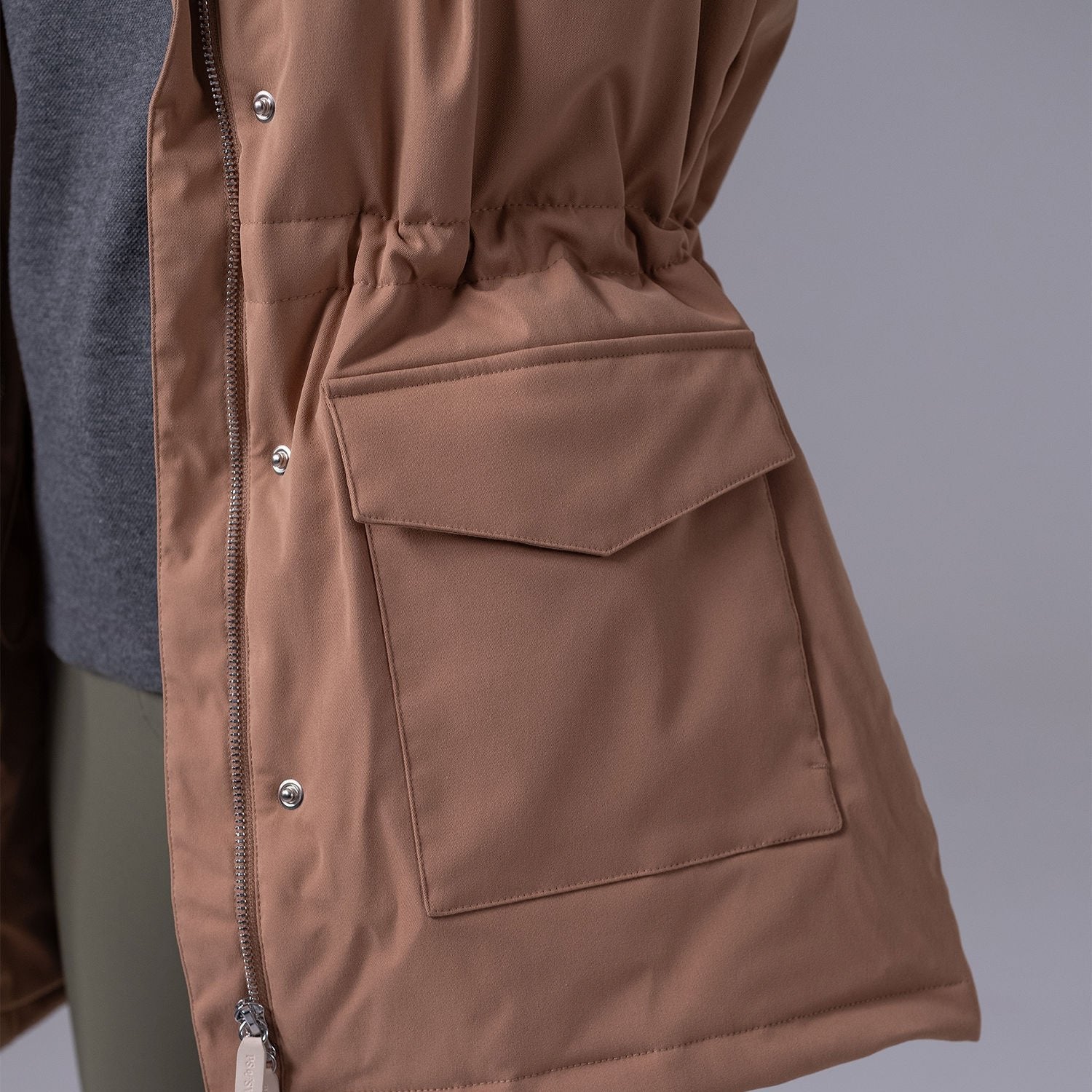 The parka also includes a detachable hood with hidden press buttons and velcro, and an elastic drawstring with silver stoppers. It is equipped with an inner zip pocket and two patch pockets with lids secured by hidden press buttons.