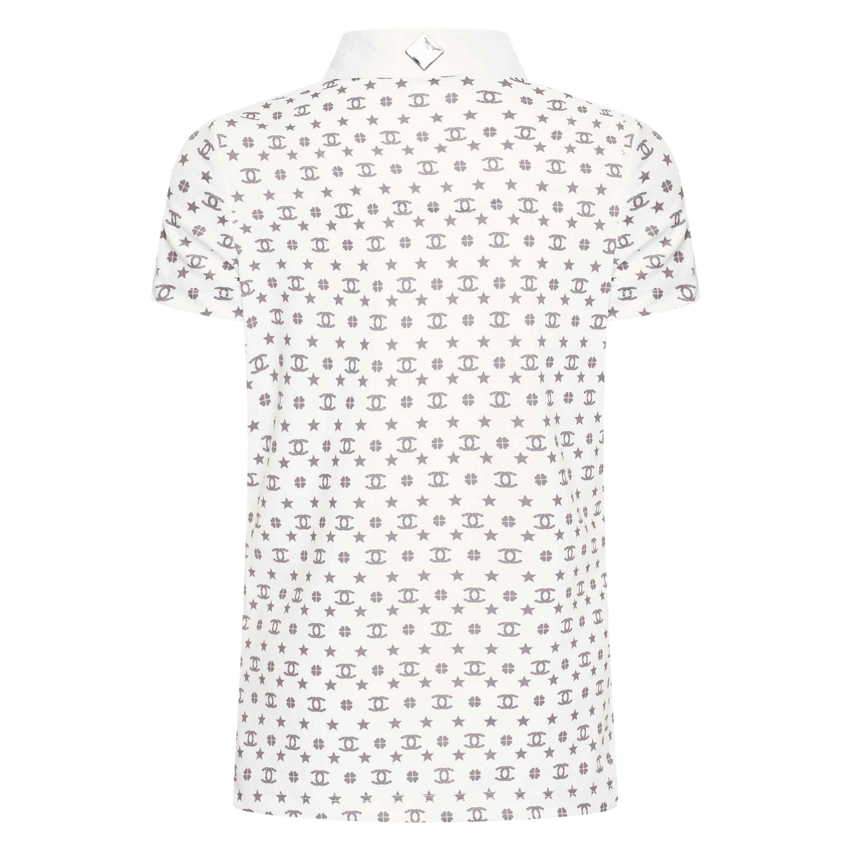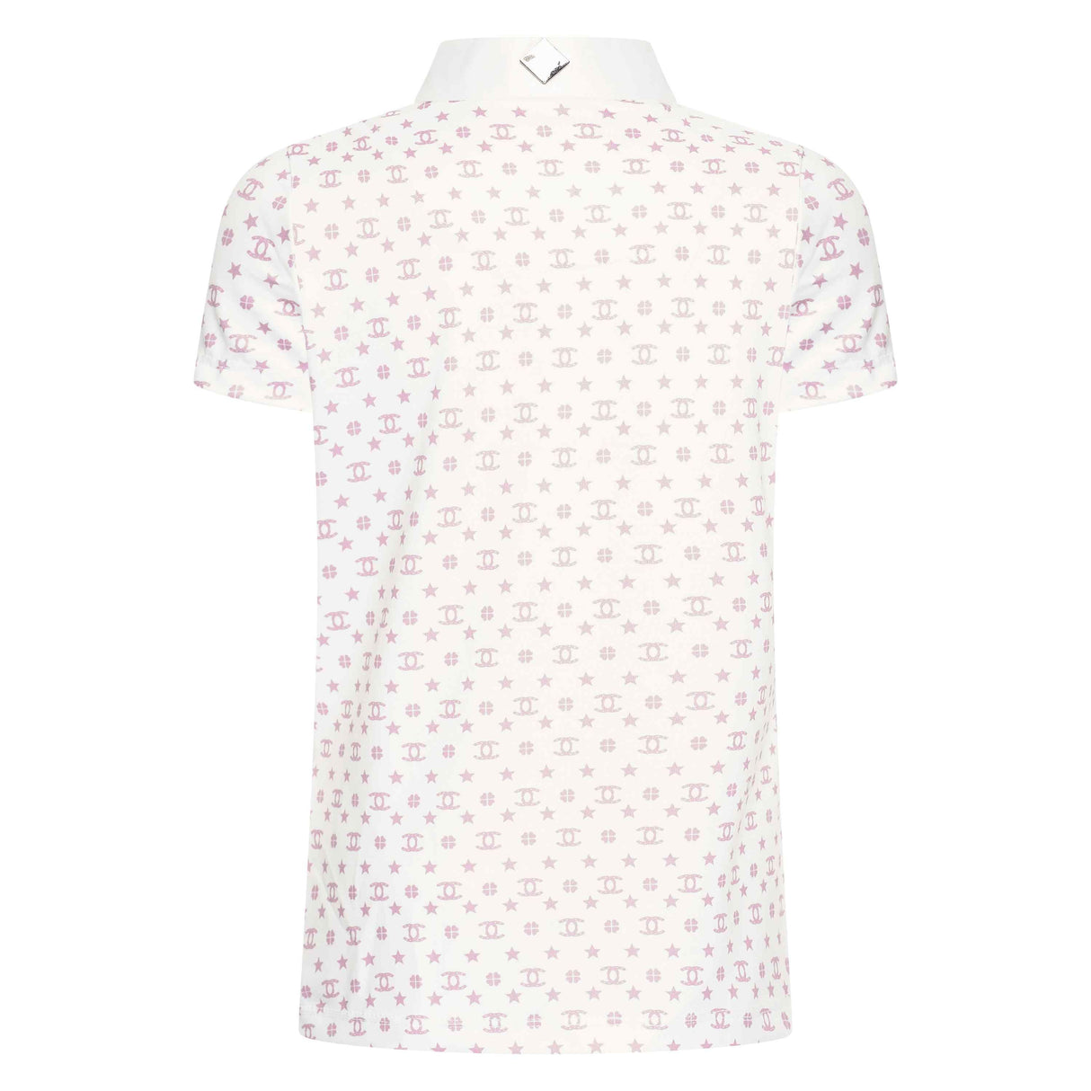 Enhance your child's equestrian style with the Imperial Riding Children's Roxy Tech Top. This competition top features a navy printed design on a white ground, with a white collarstand and fancy rhinestone buttons. The gathering at the chest adds a touch of elegance while the short slit centrefront allows for ease of movement. Perfect for any young rider looking to make a statement in the arena.