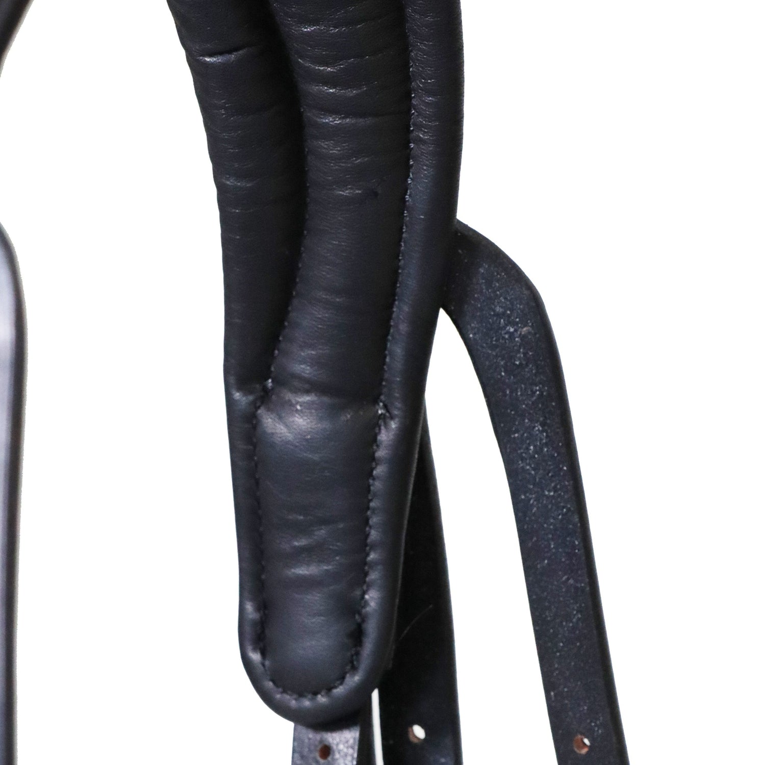 The throat lash strap has been strategically integrated into the headpiece to reduce the bulk in the sensitive TMJ area and allowing for the noseband and cheek piece buckles to lie flat against the horses skin.
