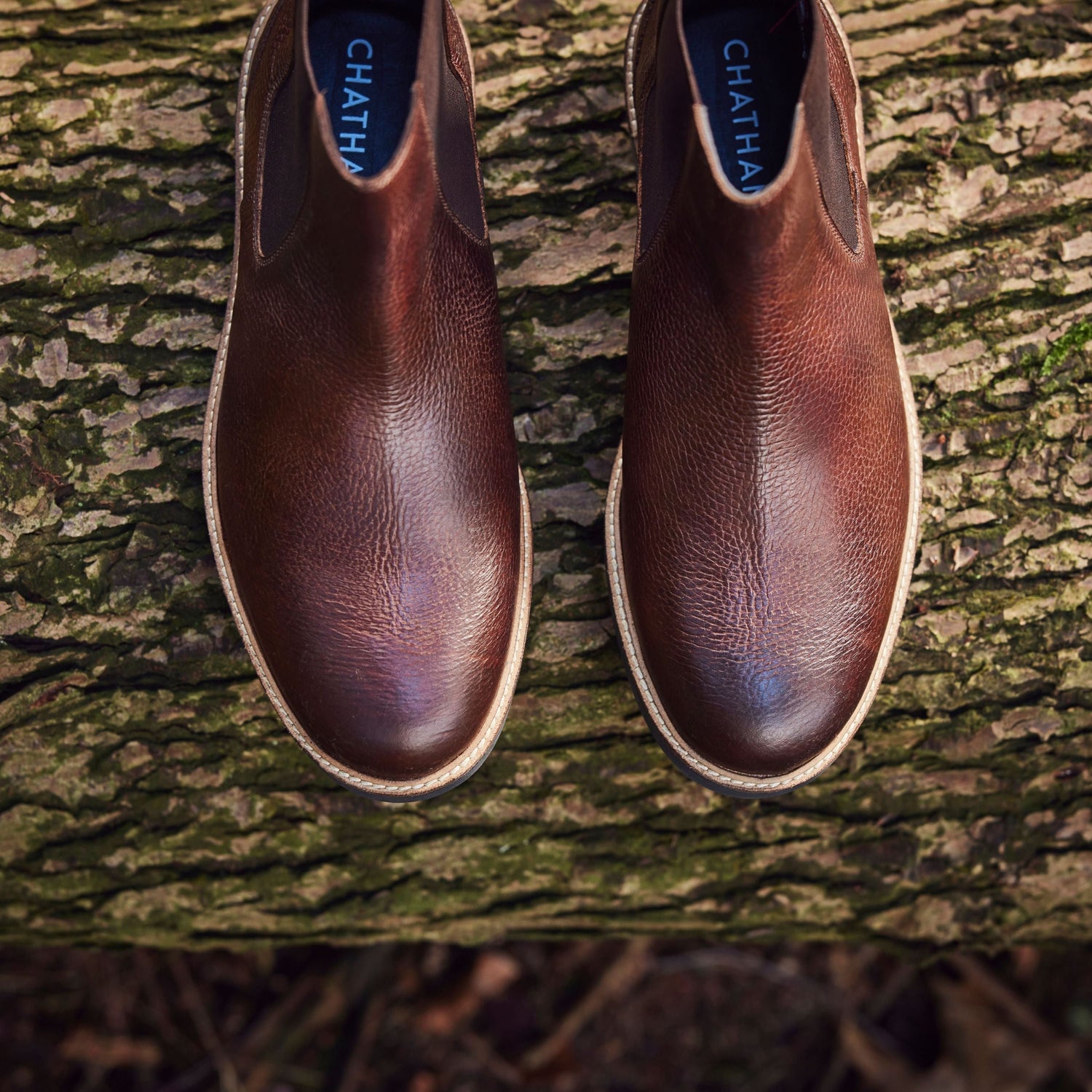 Made using premium burnished leather in autumnal tan, these casual men's boots have a smooth, rounded shape, signature elastic side panels, Chatham embossing detail, a pull-on back tab, and a checked textile and leather lining. They also feature the sole spring poron performance cushioning, which is anti-bacterial and offers maximum comfort and shock absorption, and they sit on a cleated rubber sole.