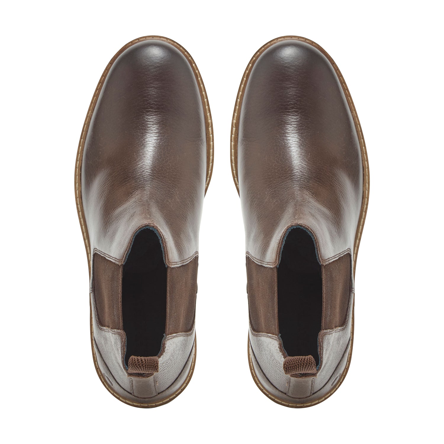 Made using premium burnished leather in autumnal tan, these casual men's boots have a smooth, rounded shape, signature elastic side panels, Chatham embossing detail, a pull-on back tab, and a checked textile and leather lining. They also feature the sole spring poron performance cushioning, which is anti-bacterial and offers maximum comfort and shock absorption, and they sit on a cleated rubber sole.