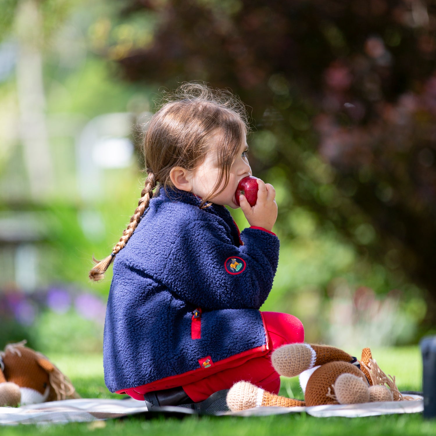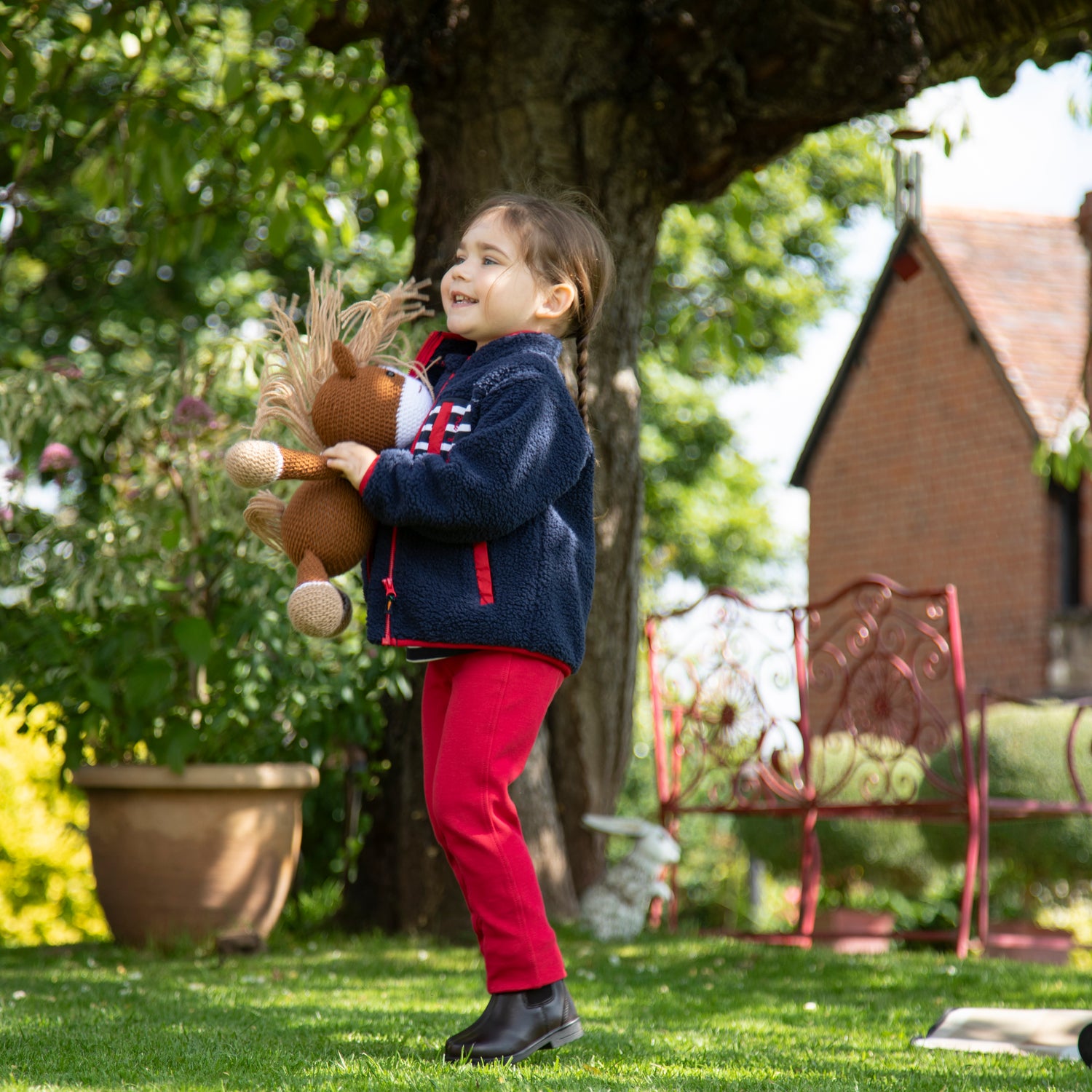 Soft and snuggly teddy fleece jacket with bound stretch hems and three zip pockets for small toys and treats. Featuring a Signature Winnie badge on the sleeve and a stripy patch on the front. Designed in deep pile cotton/fleece mix for cosy warmth with a roomy fit for layering.