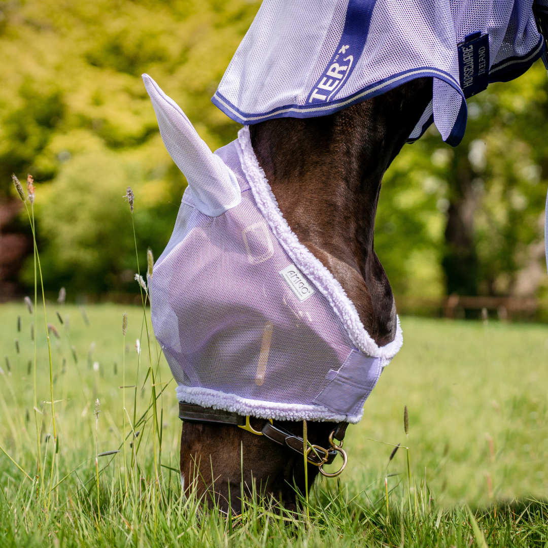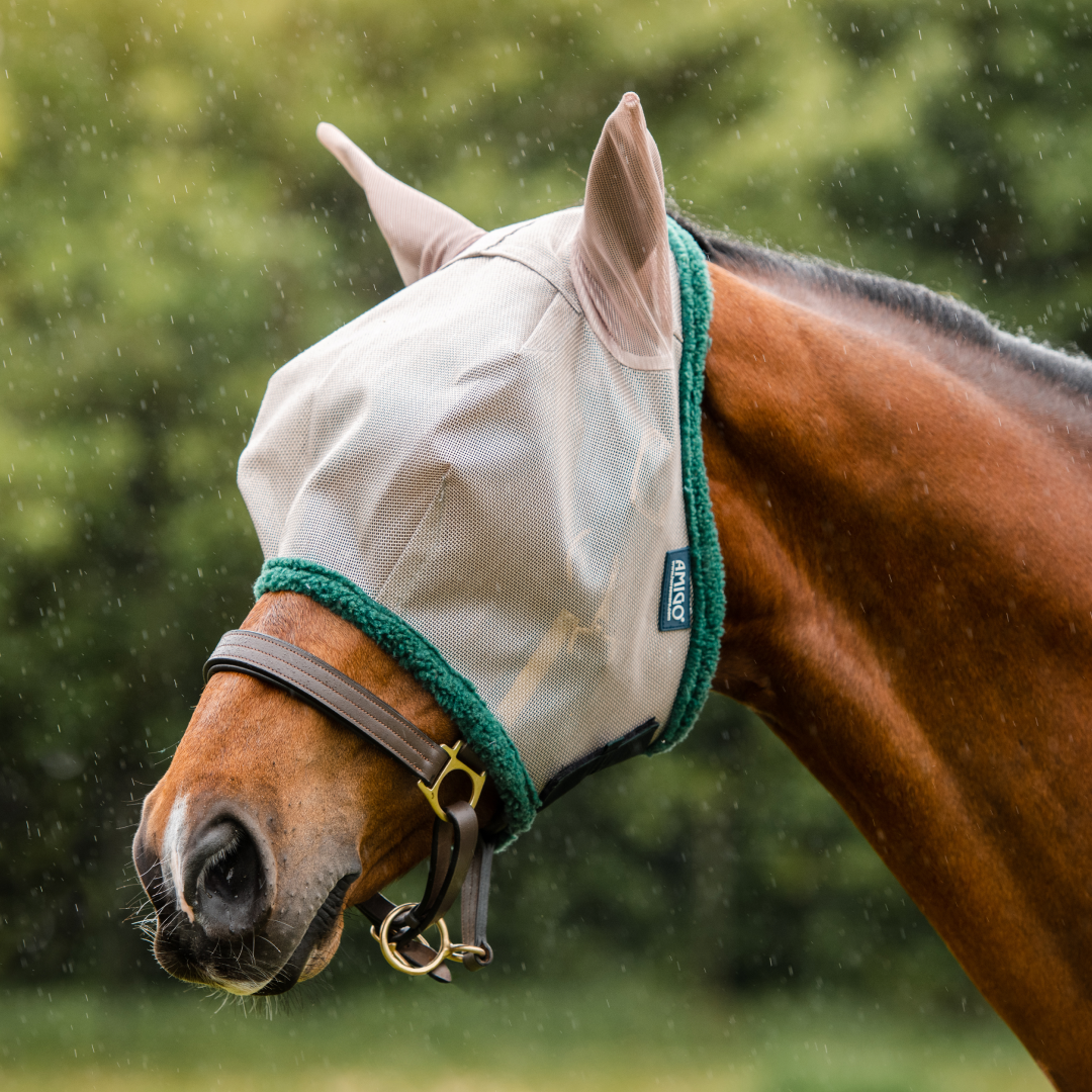 - Kontureret til at passe til din hests hoved tæt, reducerer irritation fra fluer og afspejler sollys. Fås i en række farver for at komplimentere tæpperområdet. Store passende bløde ører beskytter mod fluer.
