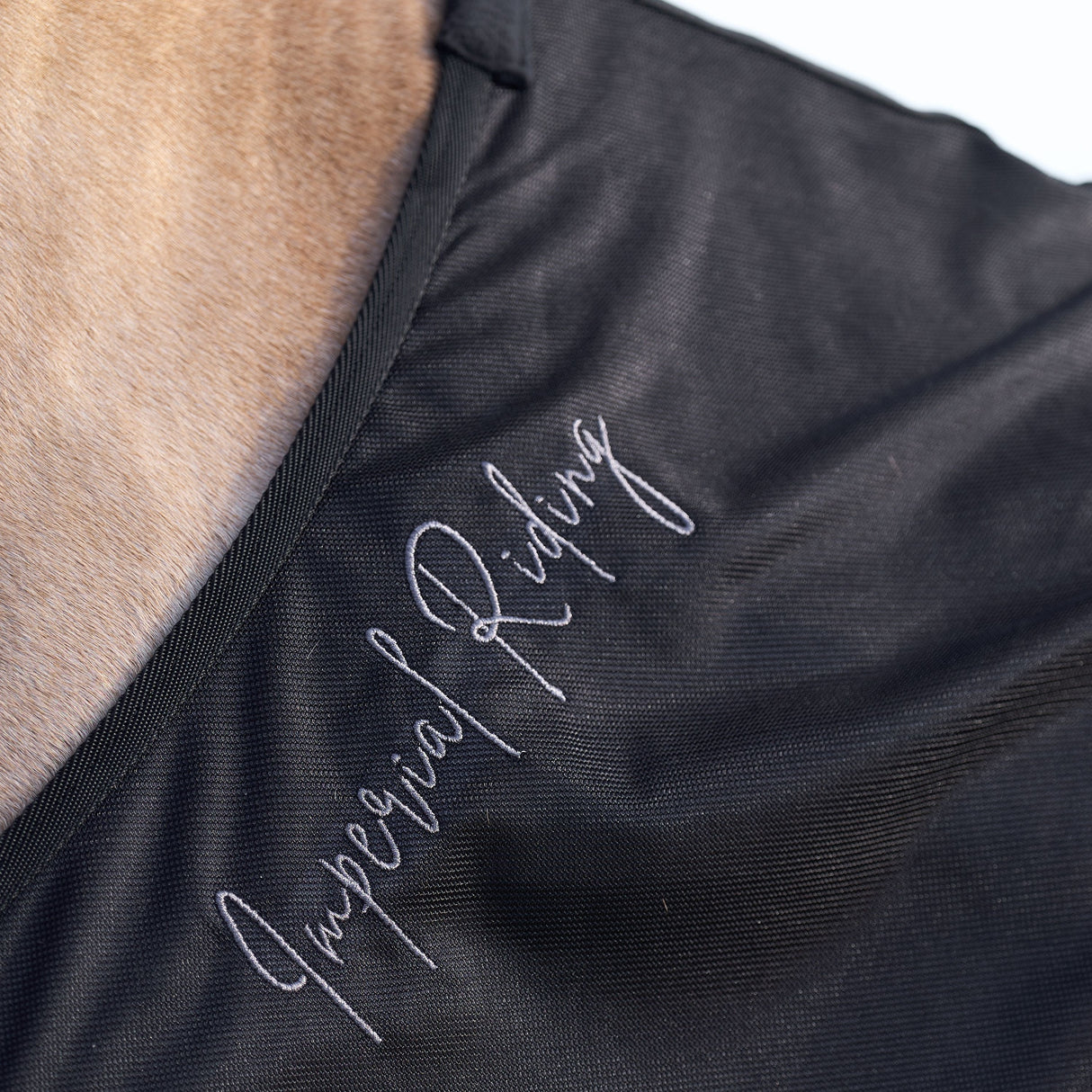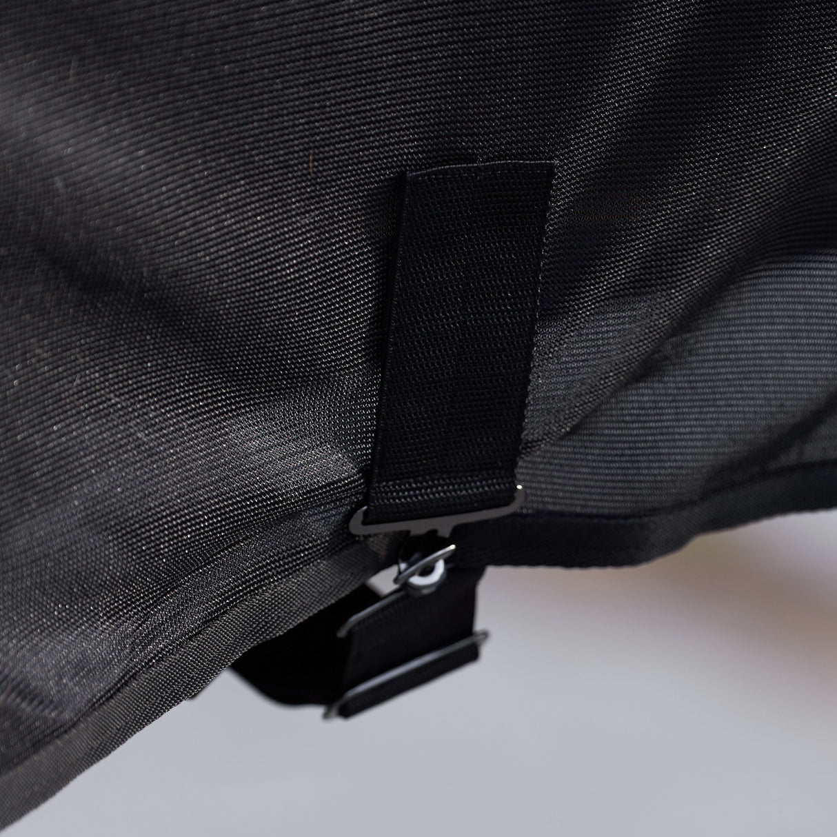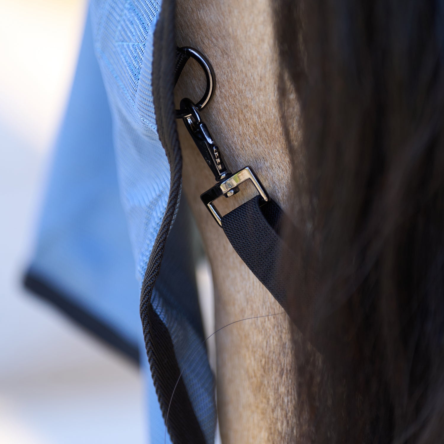 This transport blanket is crafted from breathable mesh fabric, ensuring optimal airflow during travel. It features a double front closure for secure fastening, providing comfort and protection for your horse on the journey. The metal logo ont front closure coin is a stylish detail.