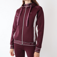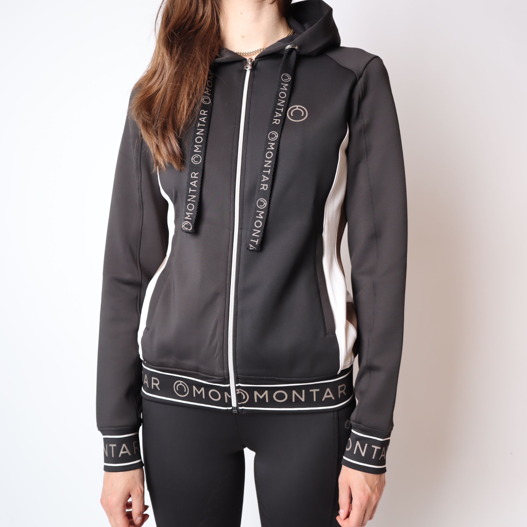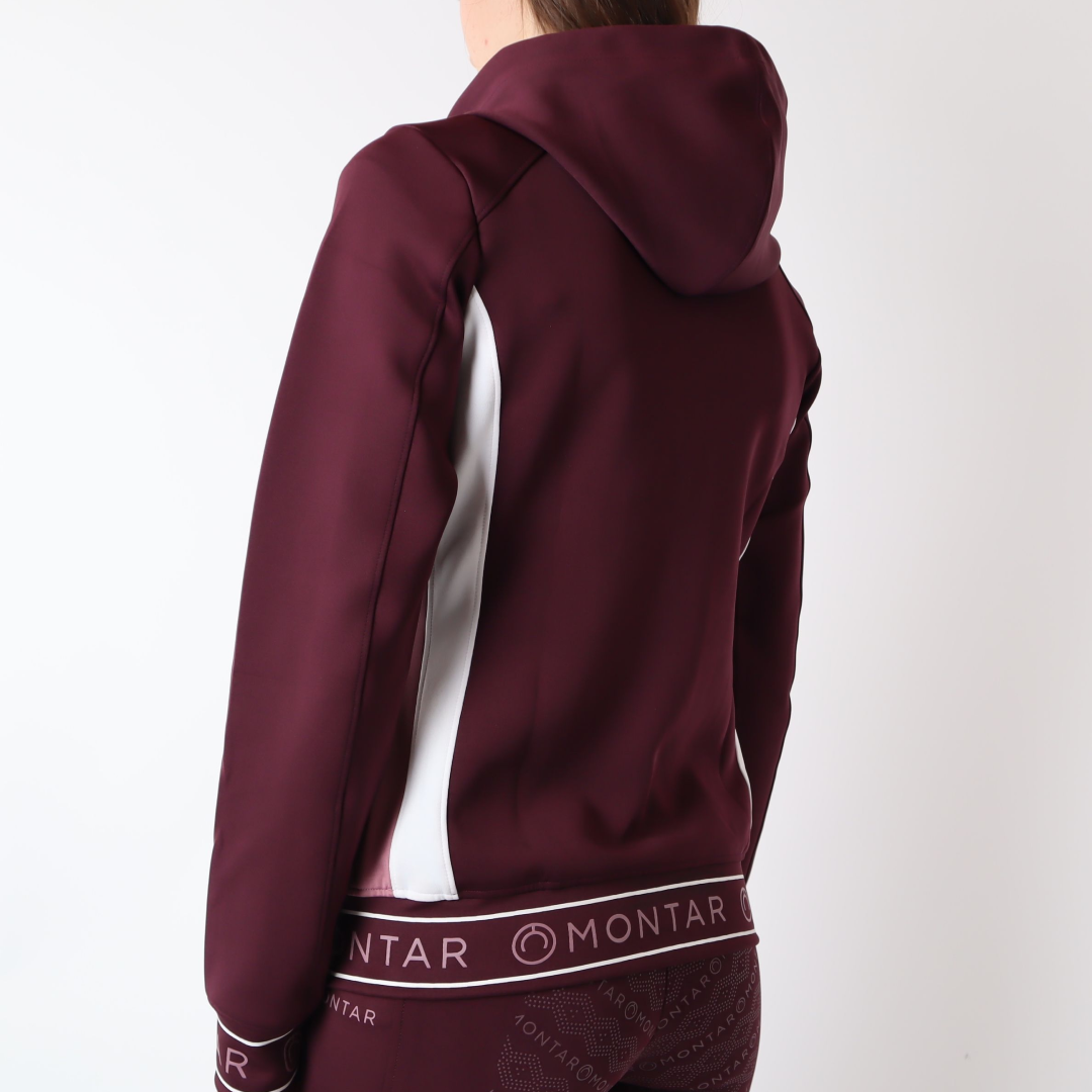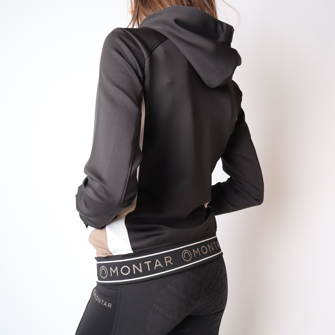 Montar Alia Hoody er med to frontlommer. Ikke kun er hætten i et meget behageligt softshell -stof, men også meget stilfuldt med et bredt logo omkring håndleddet, på hætten og på det elastiske bånd i bunden af ​​jakken. Softshell føles elastisk og åndbar uanset lejligheden.
