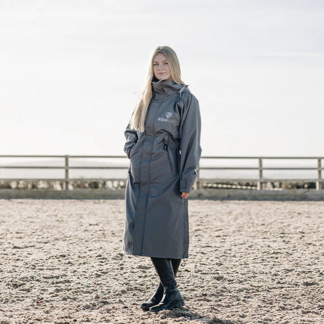 Stay dry, warm, and ready for anything in the EQUIDRY Evolution. Designed to be oversized and worn full length, this performance coat boasts a remarkable 20,000mm waterproof rating, is fully breathable, mesh-lined, and layer-friendly — even fitting over a body protector. Features include riding side zips that hold the coat securely in place and reveal hidden storm skirts that flare out in the saddle for enhanced leg coverage, along with adjustable cuffs, multiple pockets, and internal embroidery access.