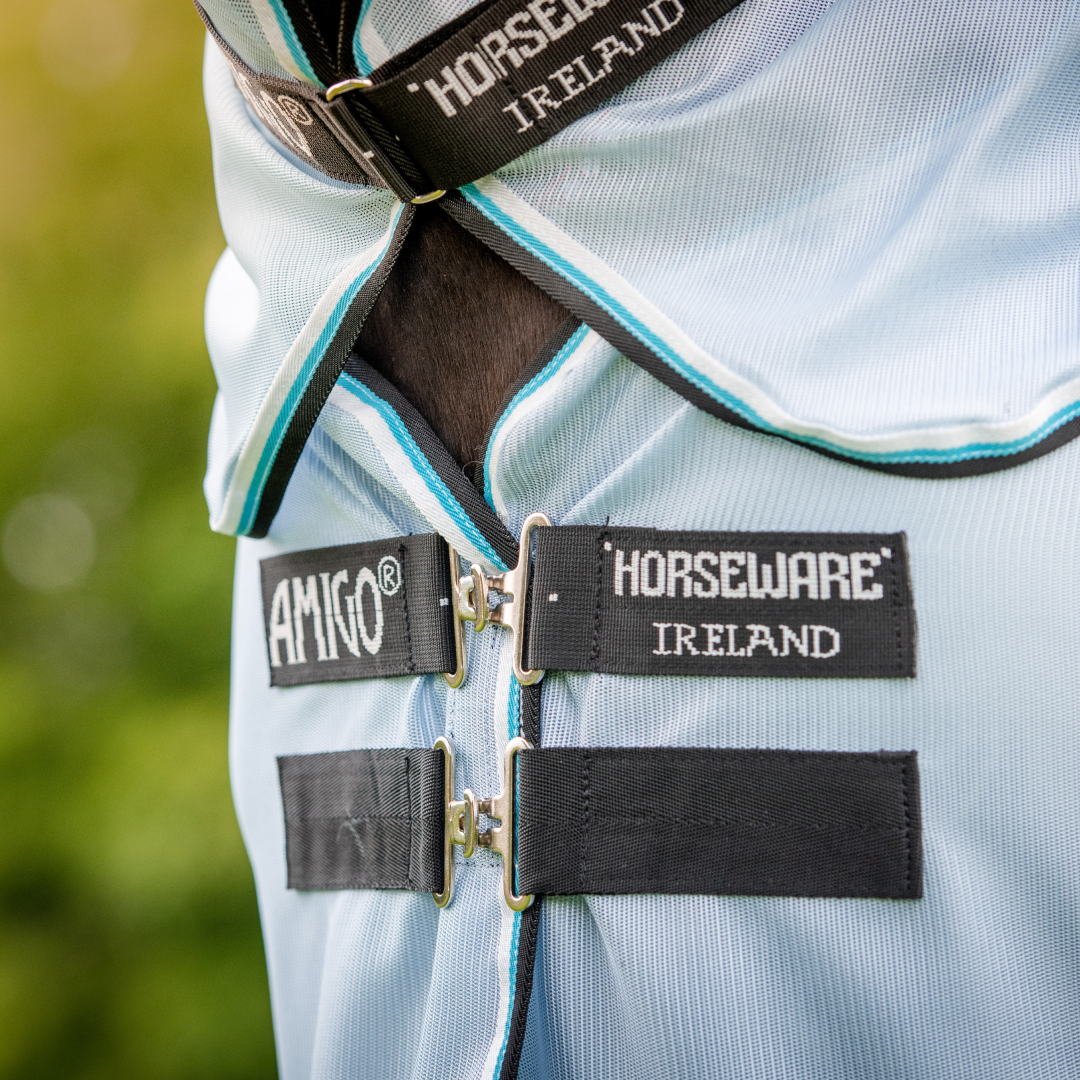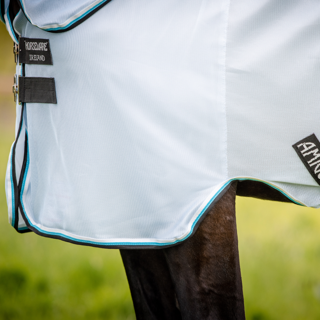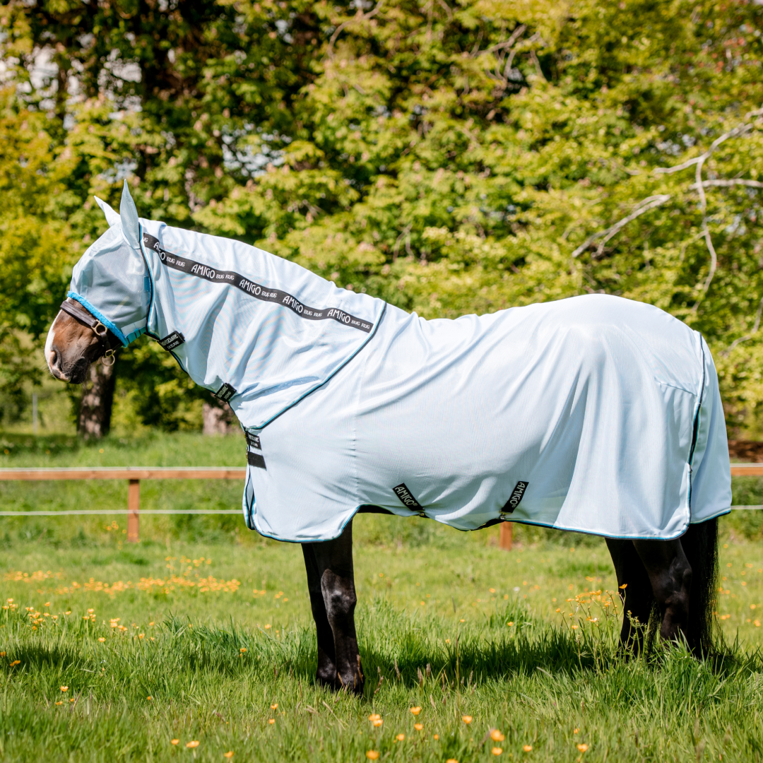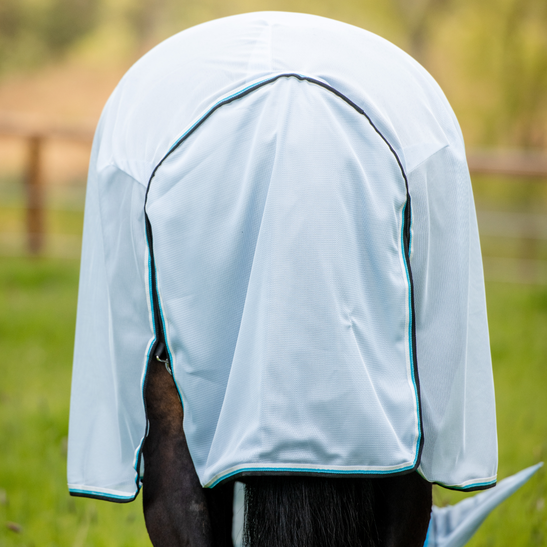 Polyester mesh -tæppe, der tilbyder god beskyttelse til fremragende værdi. Det strikkede polyesterstof er blødt, absorberende og stærkt med sol, der reflekterer egenskaber. Forbenbuer, klassisk frontlukning, silkeagtig foring langs skulder og manke, krydser surcingles, aftagelig nakkedæksel, lys farve for at reflektere sollys.