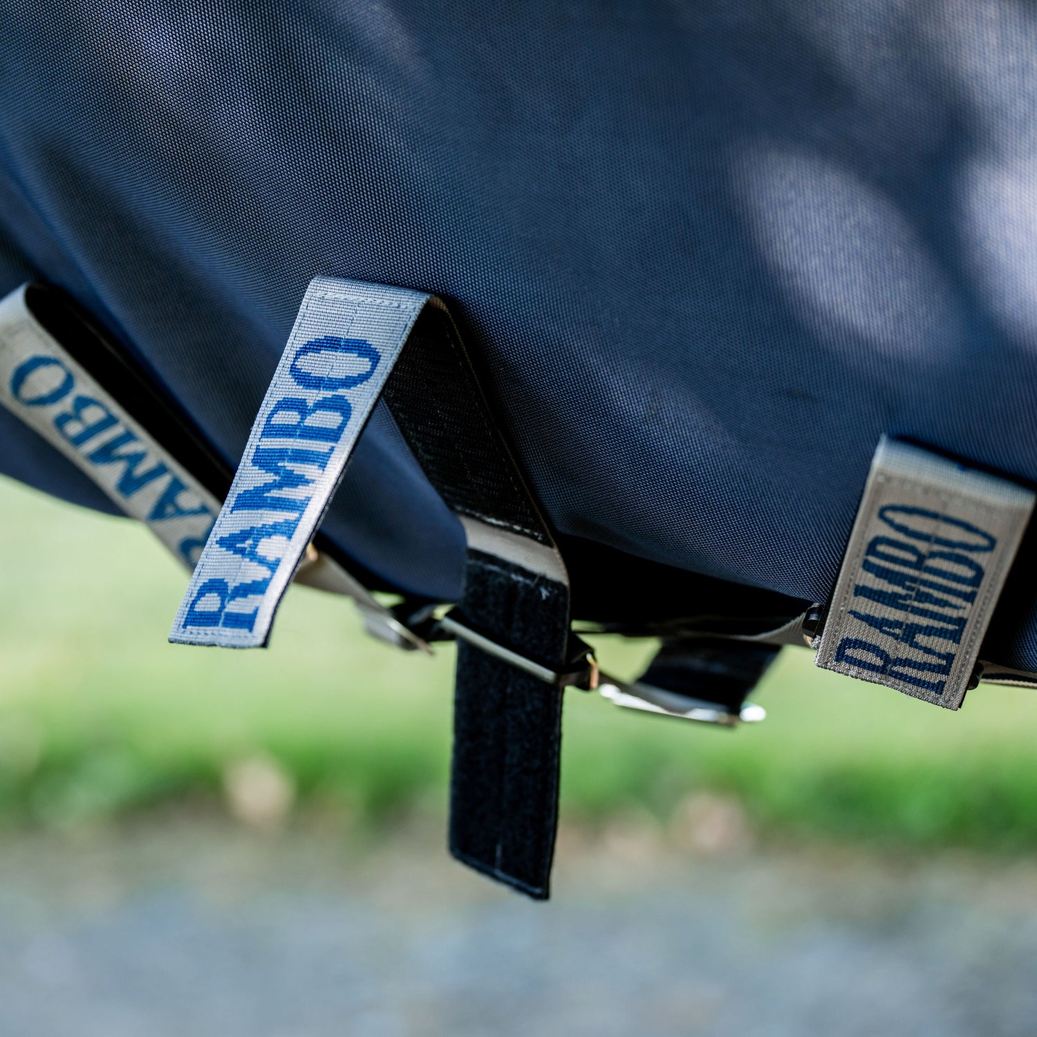 Other highlights include reflective strips for increased visibility, a waterproof tail flap for added protection, a wipe-clean tail cord, three crossed webbing surcingles with the Rambo® Safety Surcingle System for a secure fit, a Velcro sandwich hood attachment for optional hood compatibility, and leg strap compatibility for additional stability. The anti-static, anti-bacterial lining enhances both the comfort and hygiene of the rug.