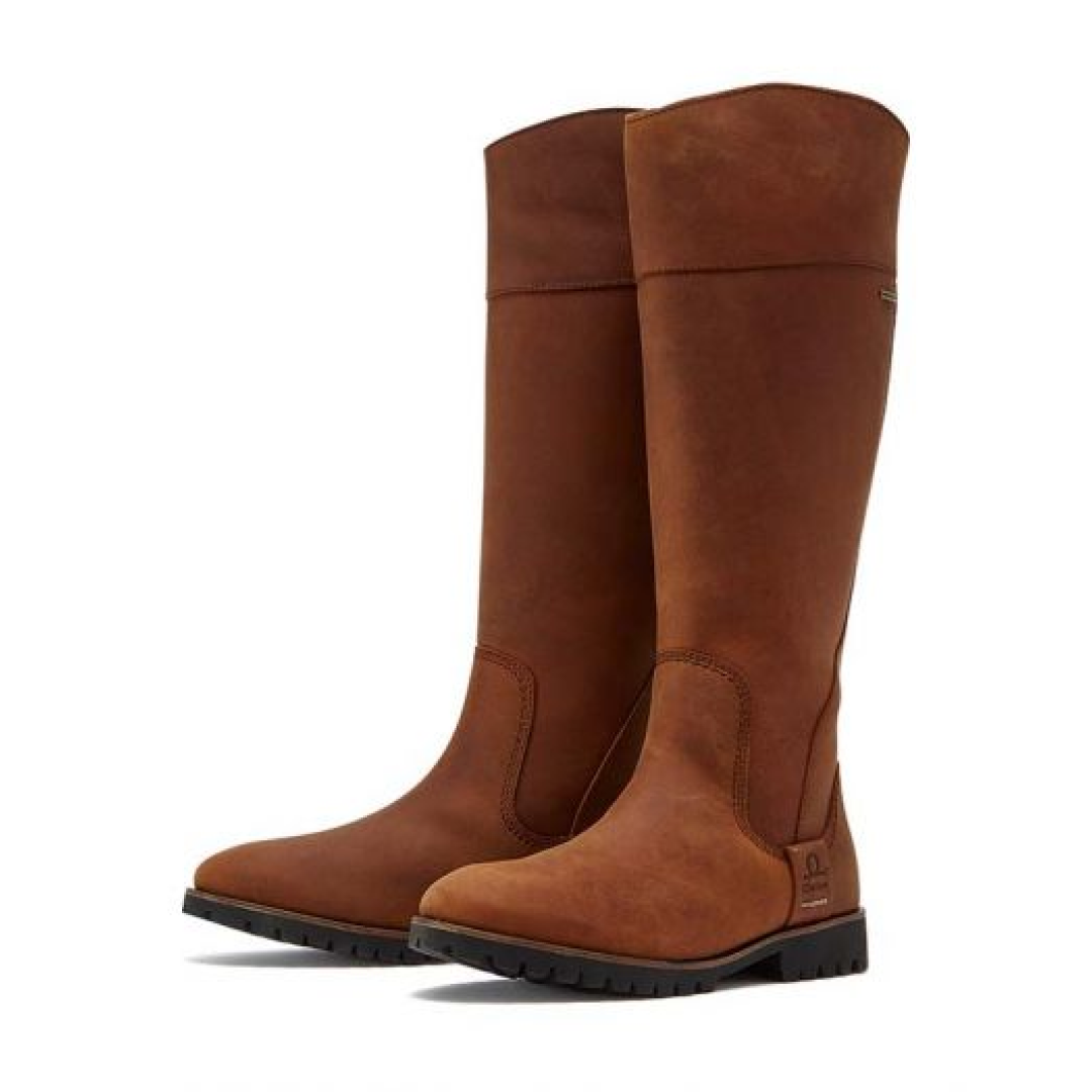 Diese stilvollen und warmen kniehohen Stiefel sind fachmännisch aus 100 % wasserdichtem Premium-Leder in einem herbstlichen Walnusston gefertigt und haben ein schlichtes Design mit einer geschwungenen Oberseite, die das Bein betont. Sie verfügen über ein atmungsaktives Mikrofaserfutter, eine Sohle mit Poron-Performance-Dämpfung, die antibakteriell ist und maximalen Komfort und Stoßdämpfung bietet, und sie sitzen auf einer langlebigen Gummi-Stollensohle.