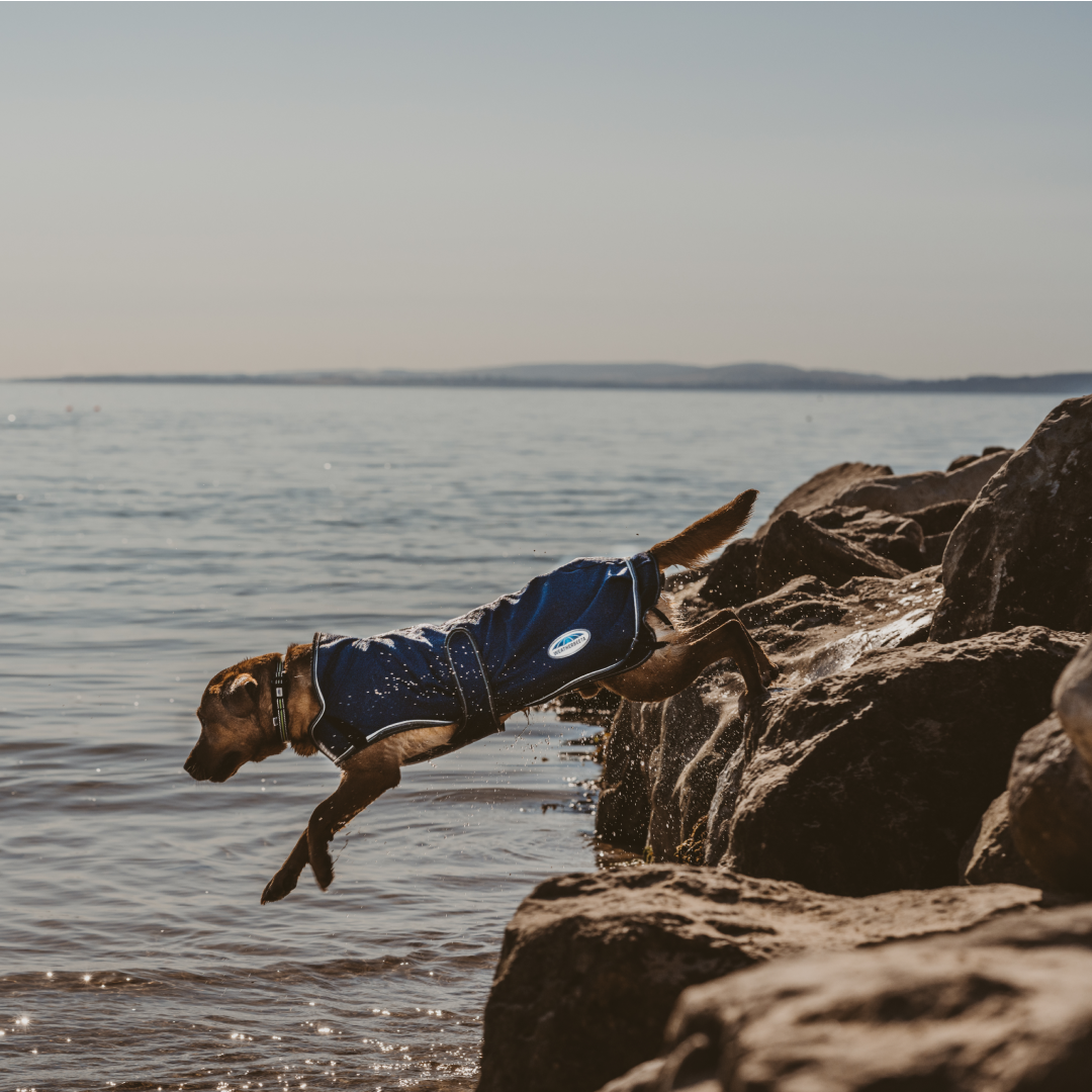 Stretch-Zwickel und gewölbte Beine für Bewegungsfreiheit mit vollständiger Bauchumhüllung und verstellbaren Klettverschlüssen für zusätzliche Wärme und Schutz bei kühleren Bedingungen. Der konturierte Rücken scheint um den Schwanz herum geformt zu sein. Mit großem Kragen, elastischen Beingurten und Loch für die Leine.