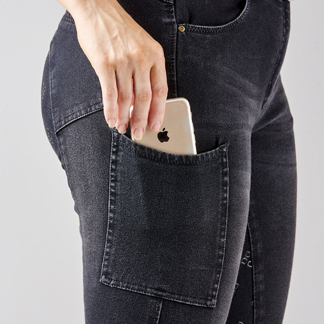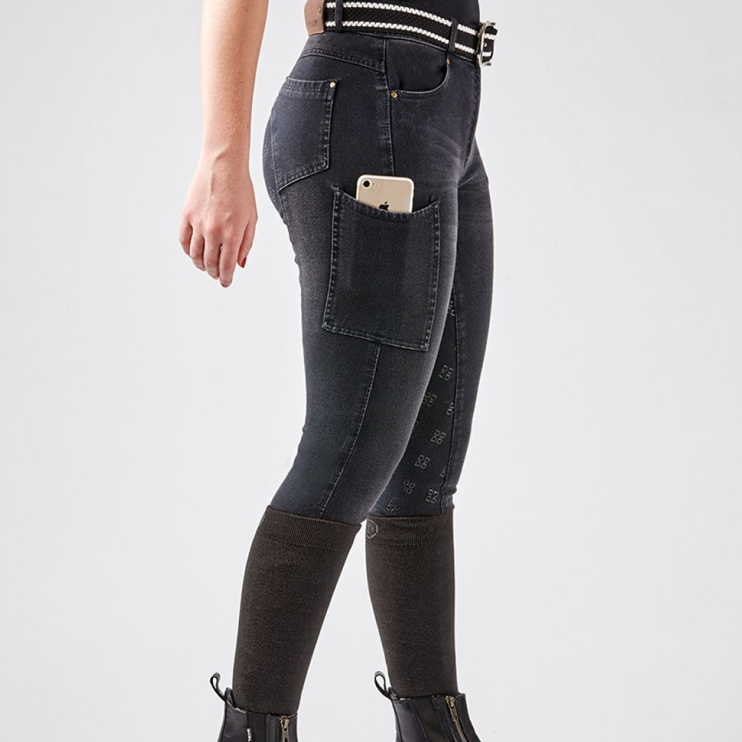 Reithose im Vintage-Waschungs-Denim-Look mit Silikon (PU)-Grip-Gel-Vollbesatz aus Bi-Stretch-Denim-Stoff, der Kompression und Schutz bietet. Mit 4 Taschen im Jeansstil und einer praktischen Außentasche für das Handy am rechten Bein. Wildleder-Gürtelschlaufen für den stilvollen Reit-Look mit Reißverschluss vorne und mittelhohem Schnitt ohne Lücken im Bund.