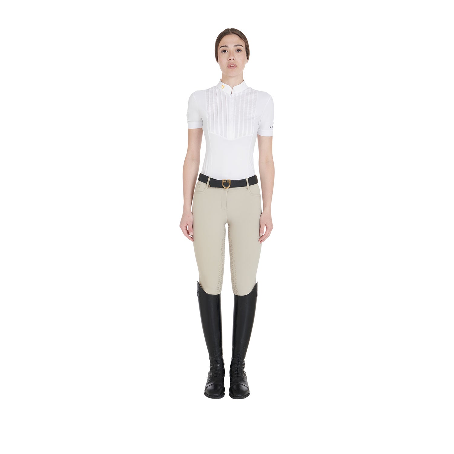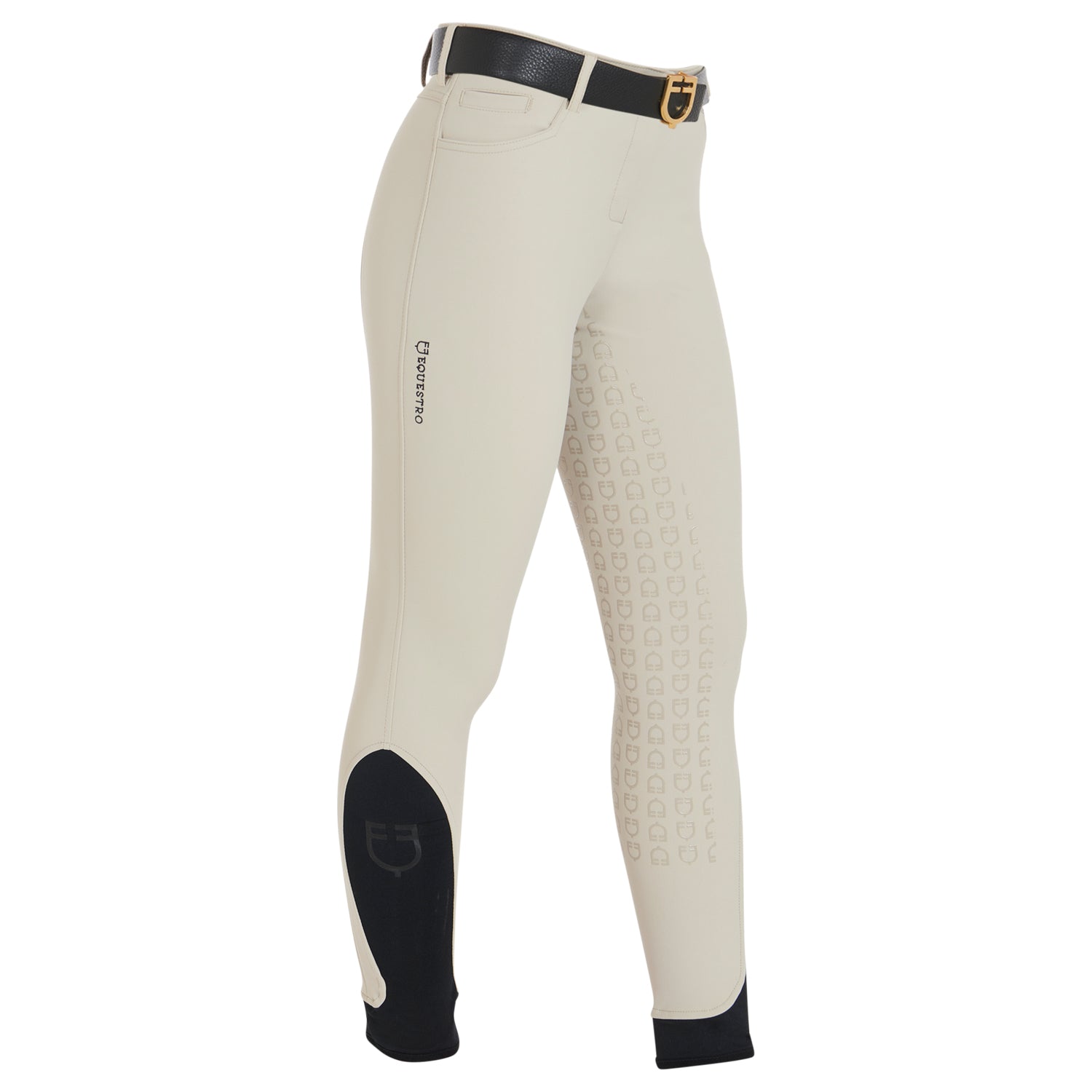 Women's Aria slim fit breeches in latest generation bielastic and breathable technical fabric. The full silicone grip with Equestro Logo guarantees excellent stability.