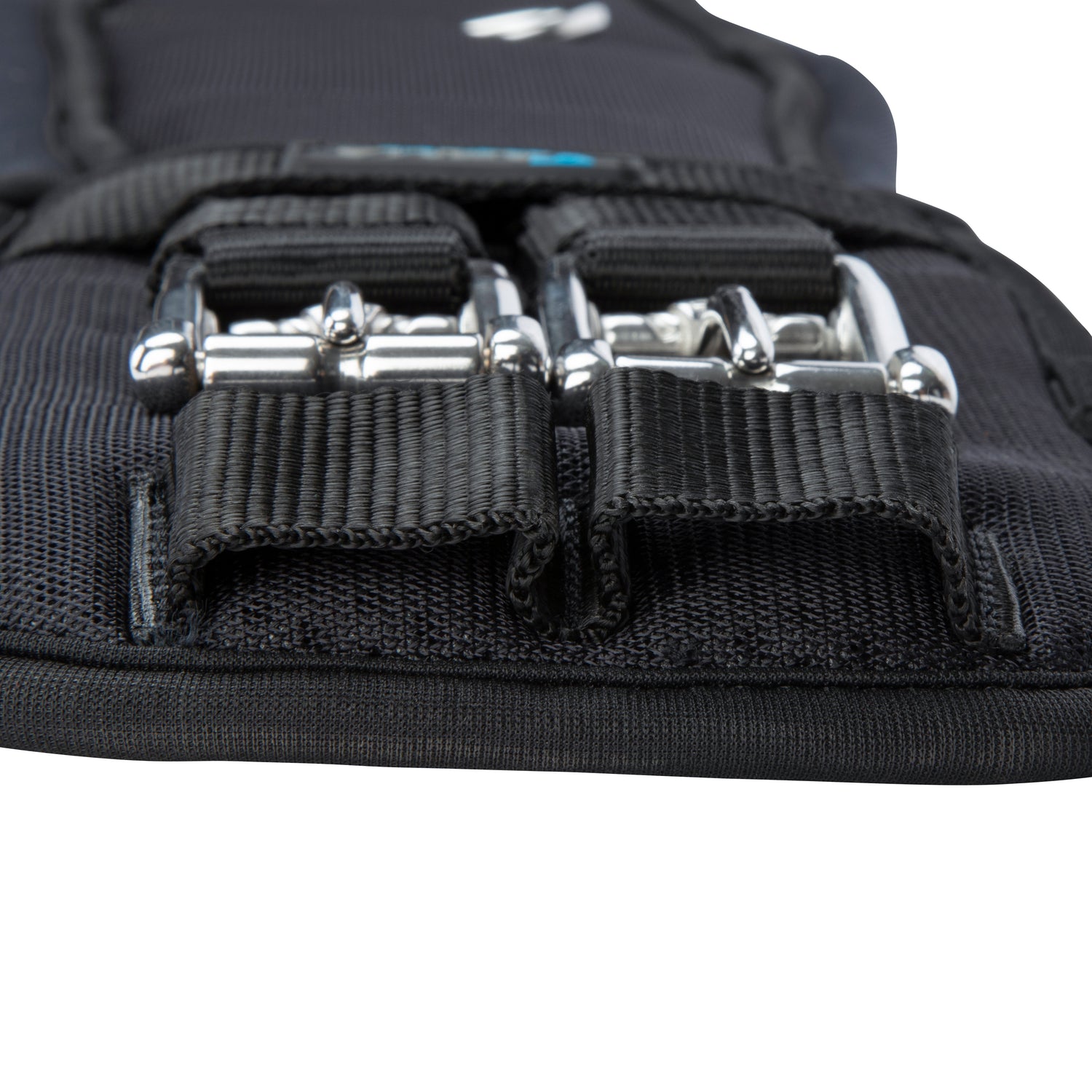 The outer girth features a 3D aerated surface to help bring air movement through to the underlayers, reducing moisture and heat build up. Contoured shaping supports the horse whilst allowing space behind the elbows for greater freedom of movement. Double layer pressure alleviating elastic inserts at both ends with curved self-closing loop bar roller buckles at one end, standard roller buckles at the other. A centre D-ring for martingale and breastplate attachment. Stainless steel fittings for long lasting performance.