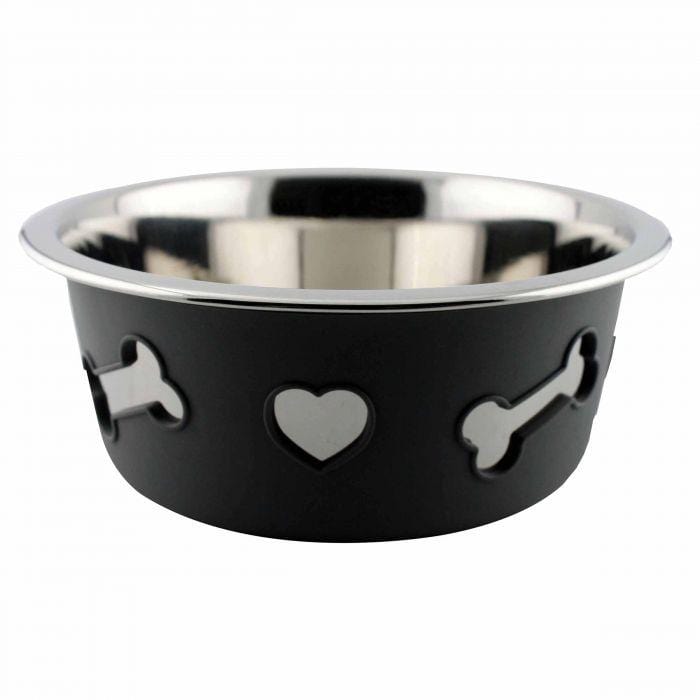 Gamelle pour chien en acier inoxydable avec un extérieur en silicone amovible. L'extérieur en silicone à motif osseux peut être retiré pour le nettoyage et aide à réduire le bruit et le dérapage.