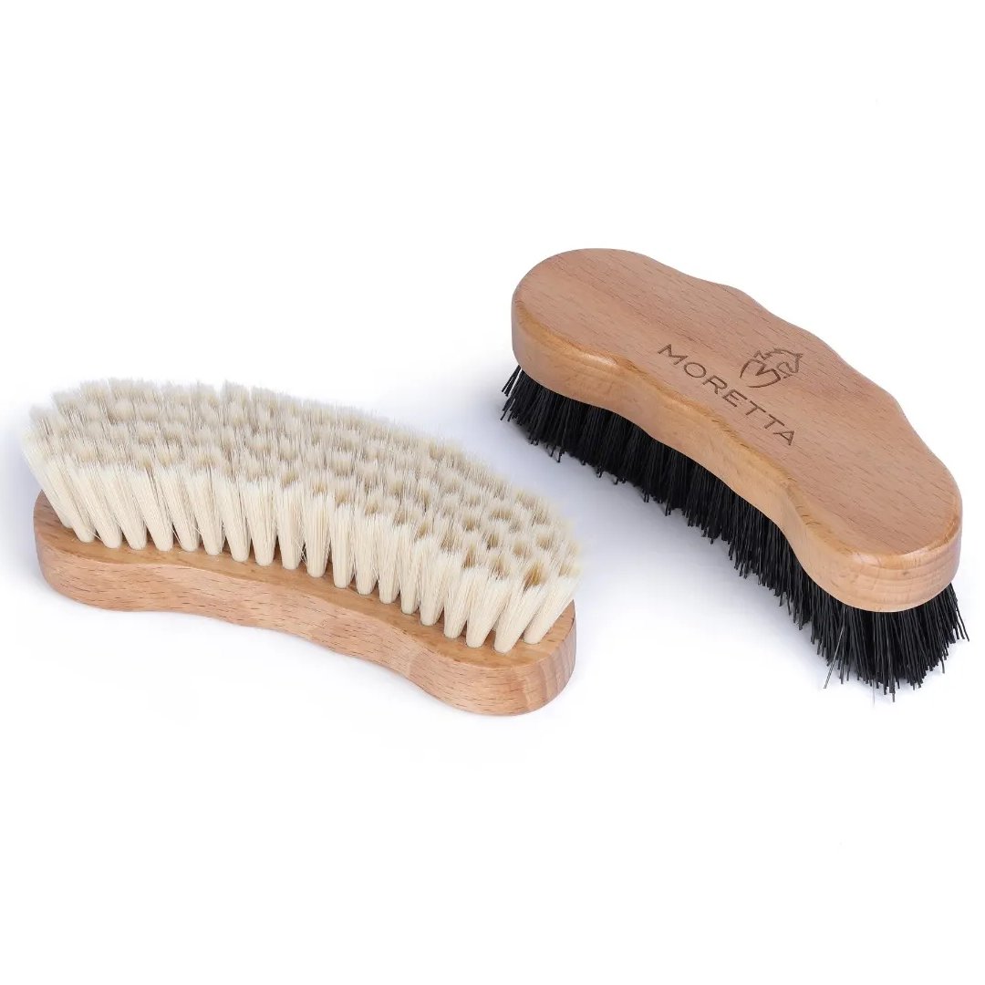Gardez vos chaussures polies prêtes à être exposées avec l'ensemble de brosses à chaussures Moretta. Composé d'une brosse rigide pour appliquer le vernis et d'une brosse douce pour polir jusqu'à obtenir une brillance élevée. Convient pour une utilisation avec des crèmes, des cires et des vernis. Nettoyez les poils avec du savon liquide et de l'eau tiède pour éliminer les résidus. Dos en bloc de hêtre avec poils en polypropylène.