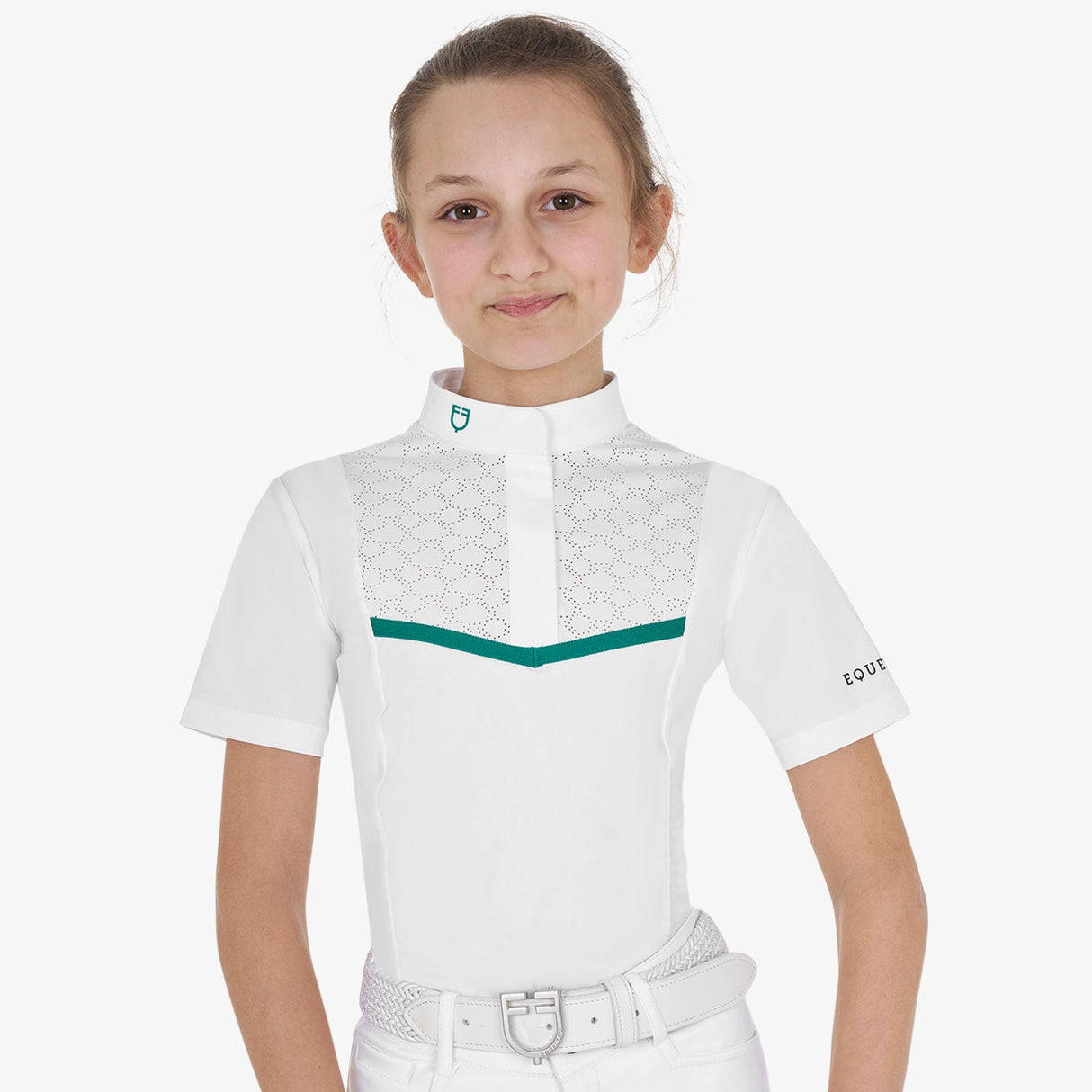 This girls' slim fit competition polo shirt combines style and performance with its innovative breathable and elastic fabric, ensuring maximum freedom of movement during summer events. The tailored cut follows the body’s natural lines without restricting comfort. Perforated inserts on the chest not only add a subtle diamond pattern but also enhance ventilation, promoting quick sweat evaporation in key areas. Designed for both comfort and elegance, this high-quality polo is perfect for competition days and beyond.