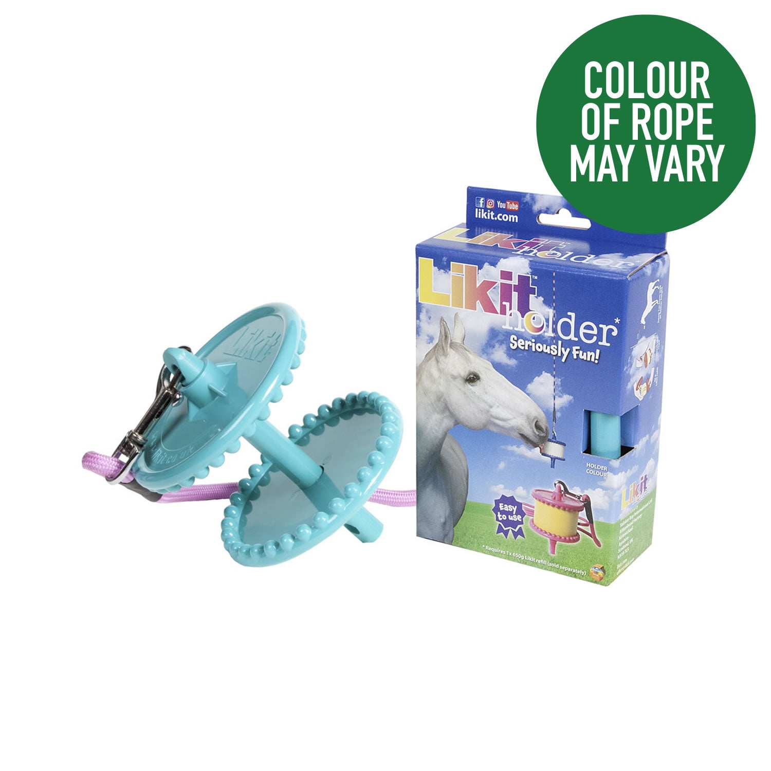 Fourni avec une corde en nylon solide et colorée, ajoutez simplement un likit (vendu séparément) pour donner à votre cheval des heures de plaisir.