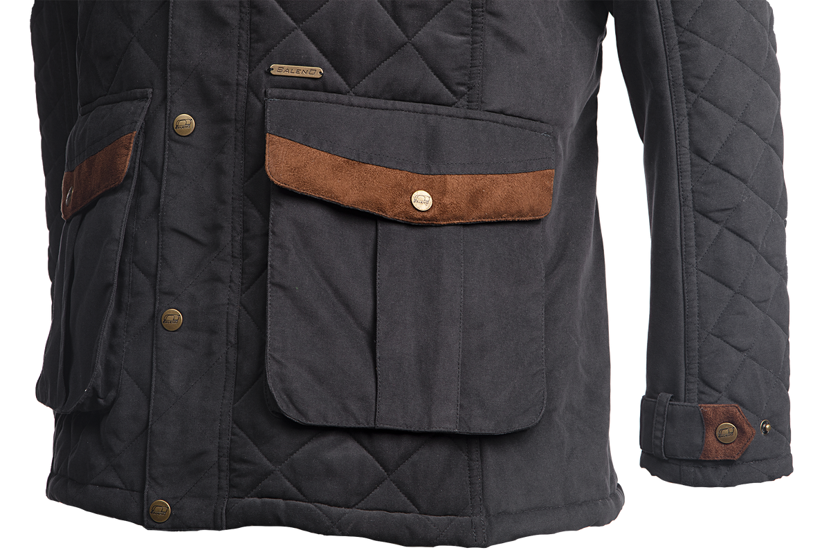 - 1 poche poitrine plaquée verticale à fermeture zippée, 2 poches plaquées à soufflet sous rabat avec bouton pression, 2 poches latérales avec boutons pression