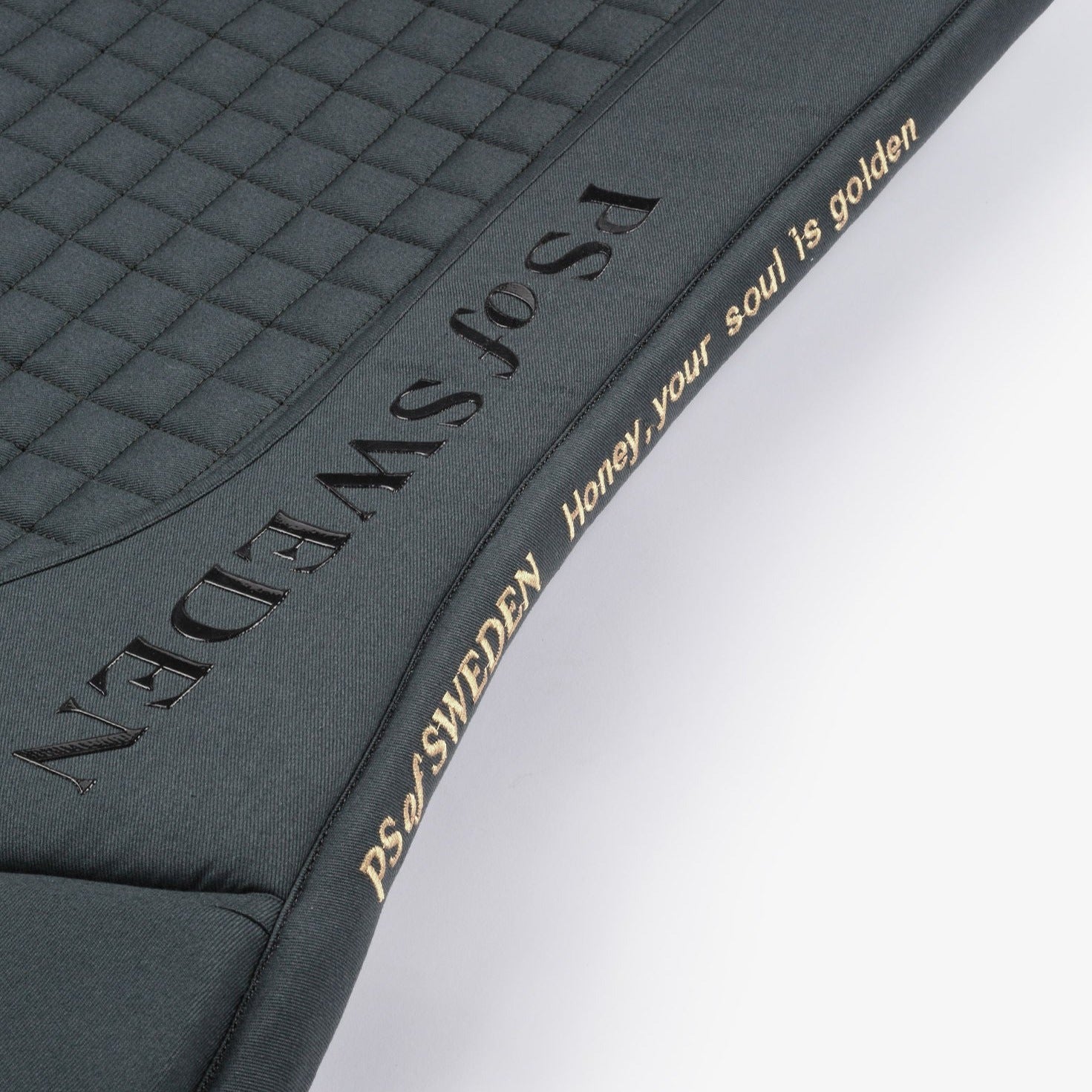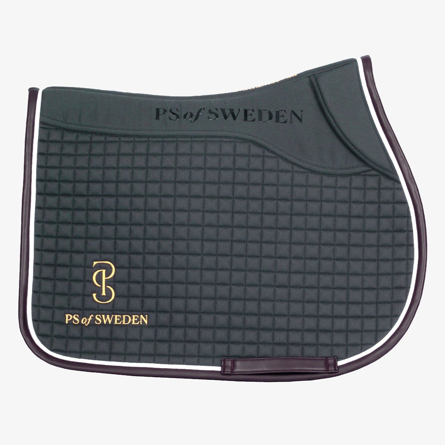 The PS of Sweden Elite Edge Jump Saddle Pad is an updated version of the Elite saddle pad, featuring a brown leather imitation edge with contrast piping. Match with Elite Edge fly hat and Elite Edge polos. Sporty and functional anatomically shaped dressage saddle pad in minimalistic design crafted in 100% cotton.