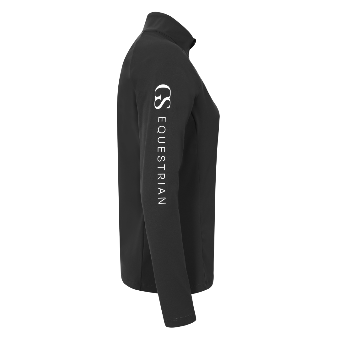 La couche de base Momentum porte le logo GS Equestrian situé sur le bras droit. Nous l'avons conçu pour qu'il soit fabriqué à partir de silicone afin de lui permettre de se démarquer des autres modèles, tout en complétant son look élégant. Étant un 1/4, nous avons veillé à ce que la couche de base Momentum ait une fermeture éclair de couleur assortie ainsi qu'un passant pour agir comme une mentonnière.