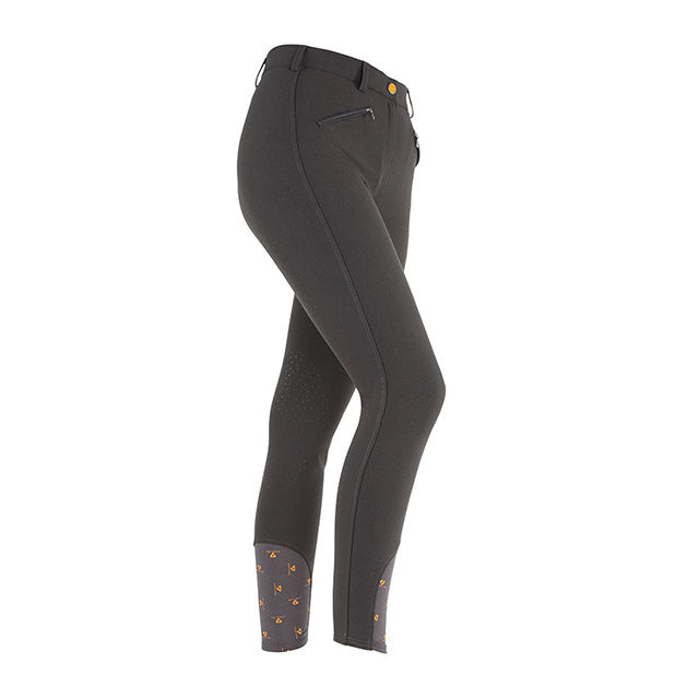Pantalon d'équitation élégant et léger en tissu extensible et performant. Détail de style : siège contour, genouillères en silicone, passants de ceinture, poches zippées sur les hanches, imprimés genoux en silicone mat, bas de jambe extensibles, imprimés Aubrion.