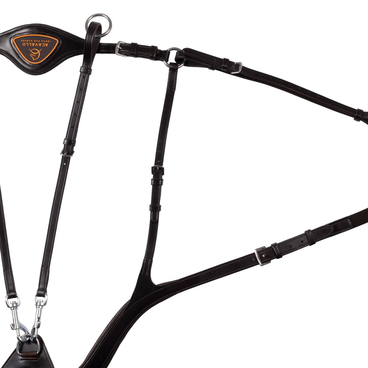 Experience enhanced stability and comfort with the Acavallo Anatomical 5-Point Breastplate. Its removable fork keeps your saddle securely in place, preventing unwanted movement toward the lumbar area. Crafted from high-quality calfskin leather and equipped with durable stainless steel buckles, this breastplate combines strength and elegance for a reliable fit during every ride.
