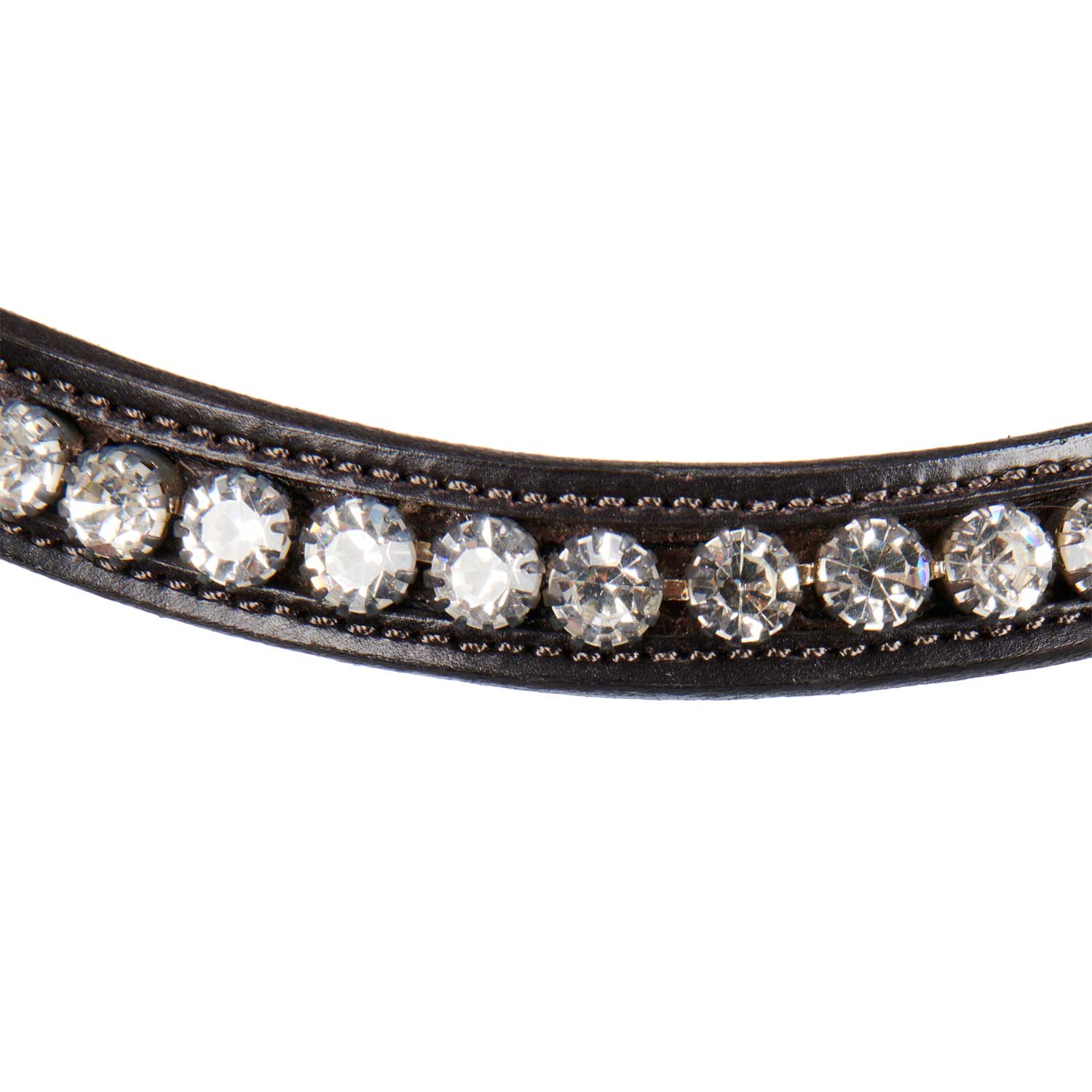 Crafted from high-quality soft Italian leather, this English bridle offers exceptional comfort and freedom of movement. Stainless steel buckles ensure lasting security and durability, while the anatomically shaped overhead distributes pressure evenly for sensitive neck areas. The padded headpiece features a pull-back fastener with a removable protective tab for easy adjustment and a perfect fit. A padded browband adorned with embedded glitter and a metal Equestro logo adds a touch of elegance. Adjustable nose clip and chin strap provide personalized comfort. Reins are not included. Elevate your riding experience with this stylish and functional bridle.
