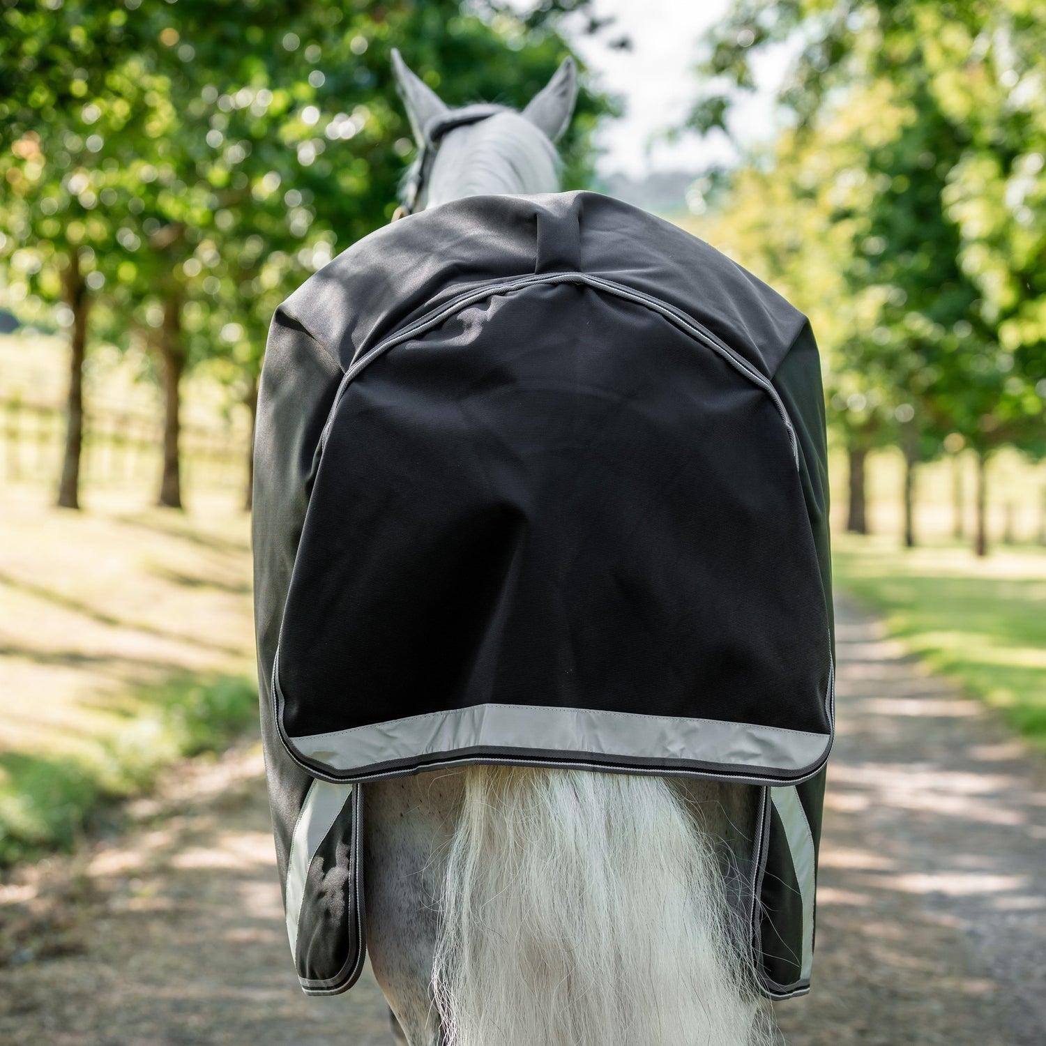 Other features include a contoured detachable hood for greater rugging choice, integrated liner loops for full compatibility with the extensive liner collection, reflective strips, wipe clean tail cord, and three crossed removable surcingle straps integrating the Rambo® Safety Surcingle System.