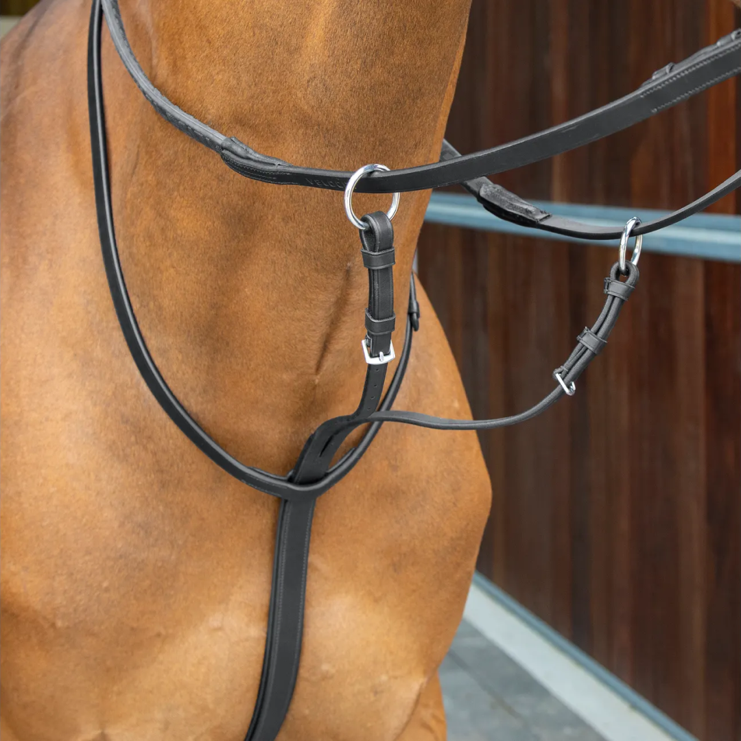 The Shires Lusso Running Martingale offers support with elegance. The centre chest section provides extra comfort being lined with soft cushioned leather. Clips quickly secure to the saddle D-rings for quick attachment, single buckle adjustment at the shoulder strap and at all other points of attachment.